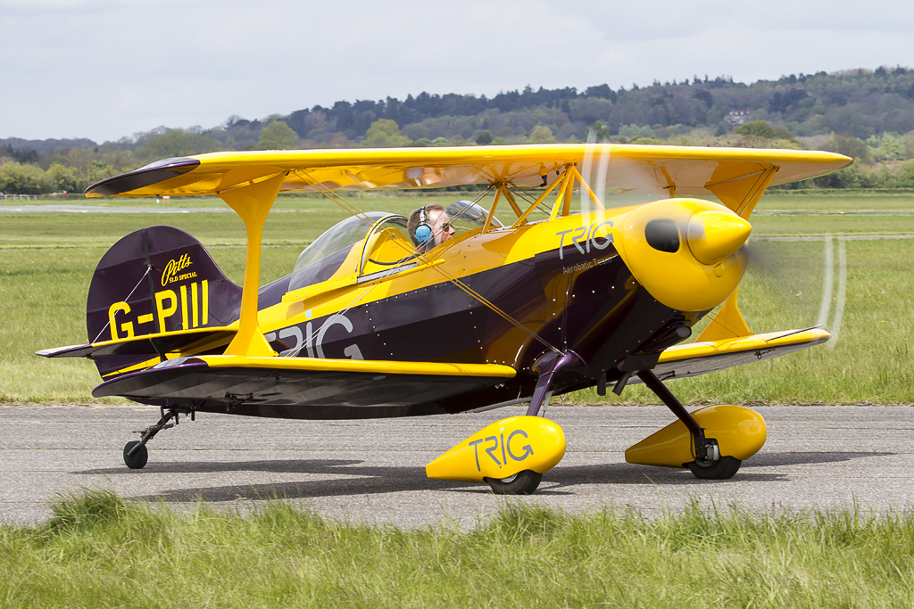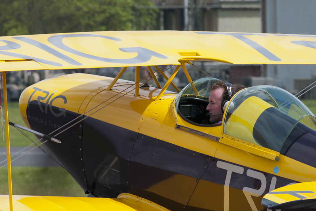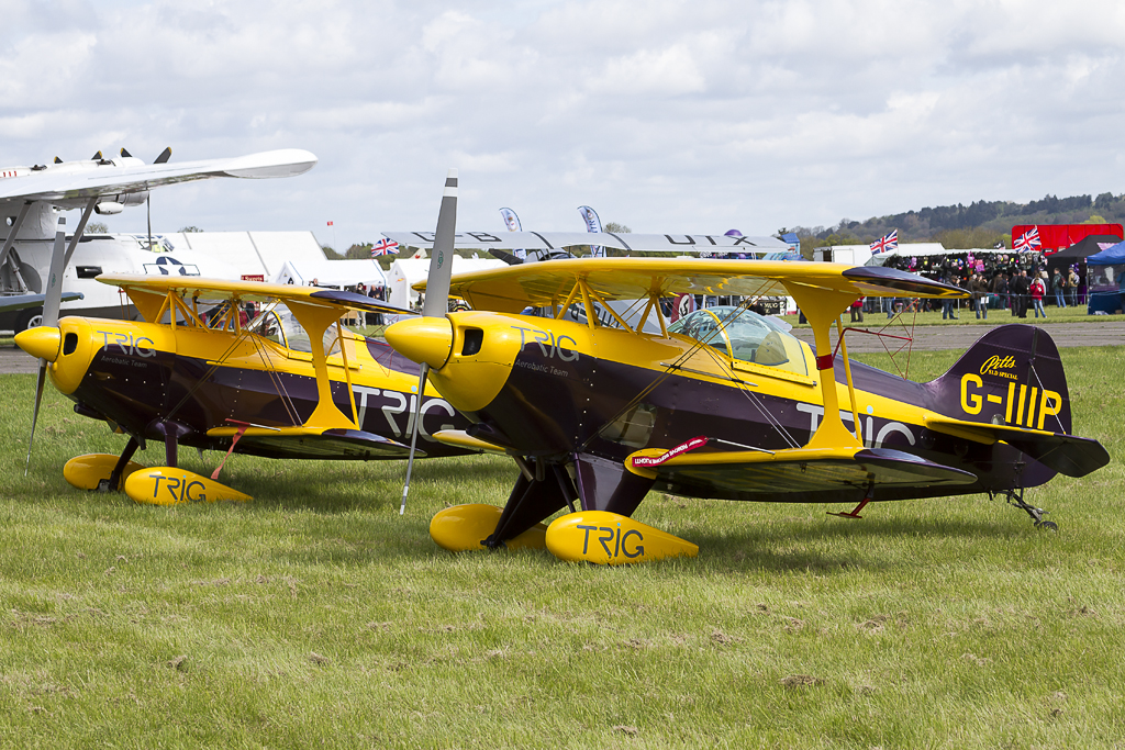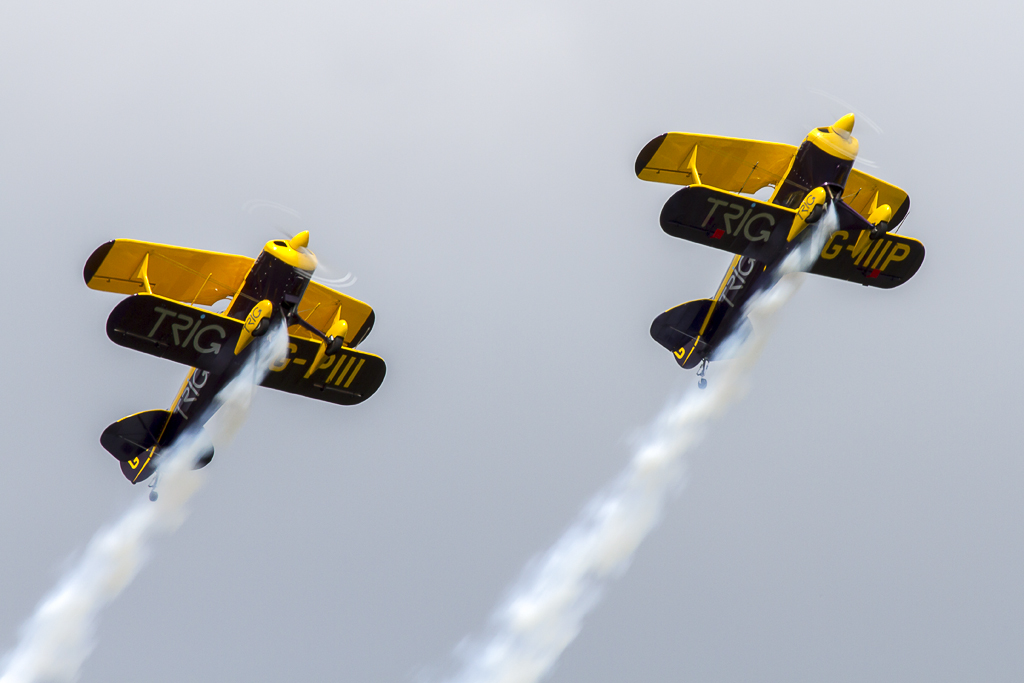 A new name for a regular airshow act was next on the agenda, as the two Pitts S-1D Specials of the Trig Team took to the skies for their display. Flown by Richard Grace and Dave Puleston the two distinctively coloured aircraft put on their usual high standard of close formation flying, leaving a trail of white smoke over the airfield that contrasted with the rapidly approaching grey skies.