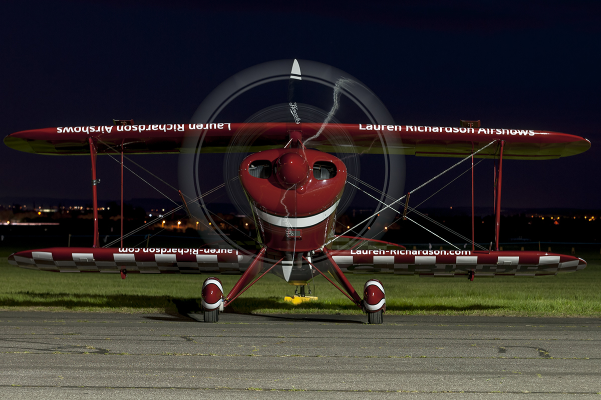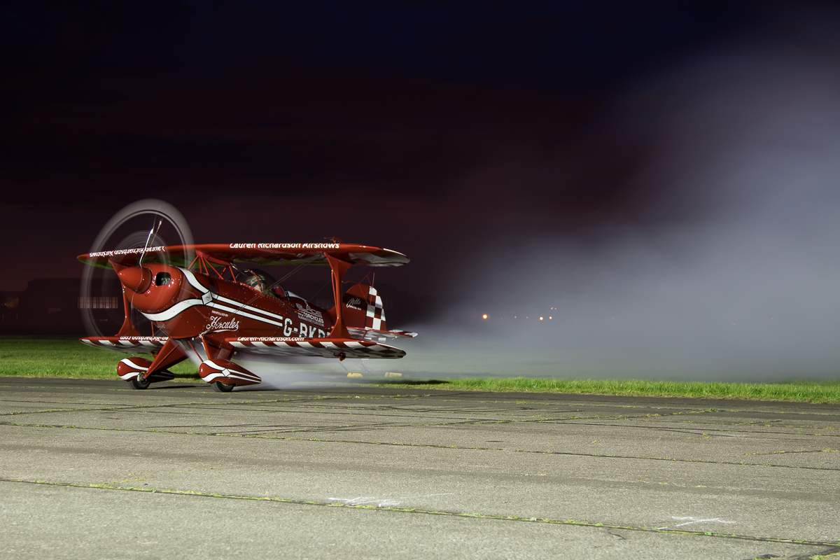 Providing the second engine run of the night was well regarded display pilot Lauren Richardson in her Pitts S-1S G-BKDR. With the red and white scheme standing out very well against the ever-darkening skies, the engine run lasted for a good five minutes (plenty of time to move about for different angles) and included three short bursts of smoke which added an extra dimension to the photographs.