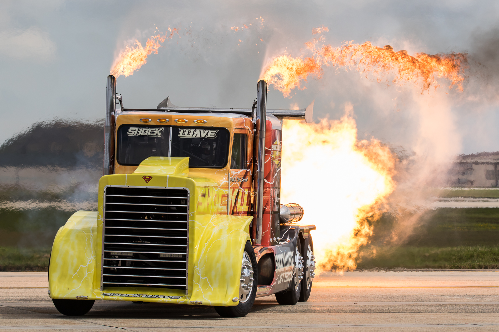 Keeping with Aerobatics, albeit much more advanced than the Cadet is capable of, were two of the leading pilots in the country. Patty Wagstaff holds an incredible number of records and achievements in both competition and display flying and her display at Andrews was testament to her skill. Flying an Extra 300S, she barely spent anytime flying straight and level with an exceptionally performed display. Following on later in the afternoon was a similarly well-respected display pilot in Matt Chapman this time with an Extra 330LX. Following the completion of his superbly executed routine, it was time for a race between him and the Shockwave Jet Truck. For those unfamiliar with Shockwave, this truck is powered by three Westinghouse J34 turbojets and capable of hitting over 370 mph – a truly serious piece of kit! With a standing start for the truck, the Extra dove for the start line and, as the race progressed in front of a huge wall of flame, Shockwave soon made up the advantage to cross the finish line first.
