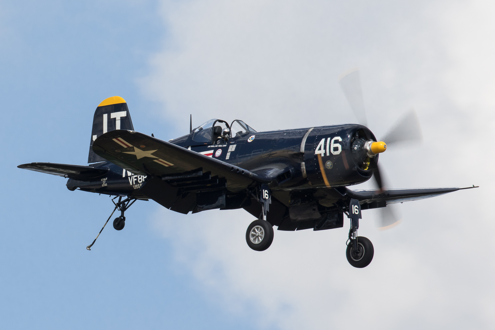 Although not part of the Pacific war set piece, another pair of warbirds were present in the display line up as the Class of ’45. Opening with Jim Tobul performing a solo routine in his F4U-4 Corsair, he was soon joined by Scott Yoak in P-51D Mustang for a truly wonderful pairs display. The Corsair is a true war veteran having seen action during the Korean War completing over 200 combat missions with two units – VF-884 ‘Bitter Birds’ (the scheme in which it wears) aboard USS Boxer and VF-653 aboard USS Valley Forge.