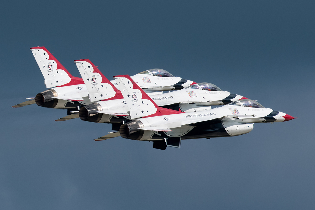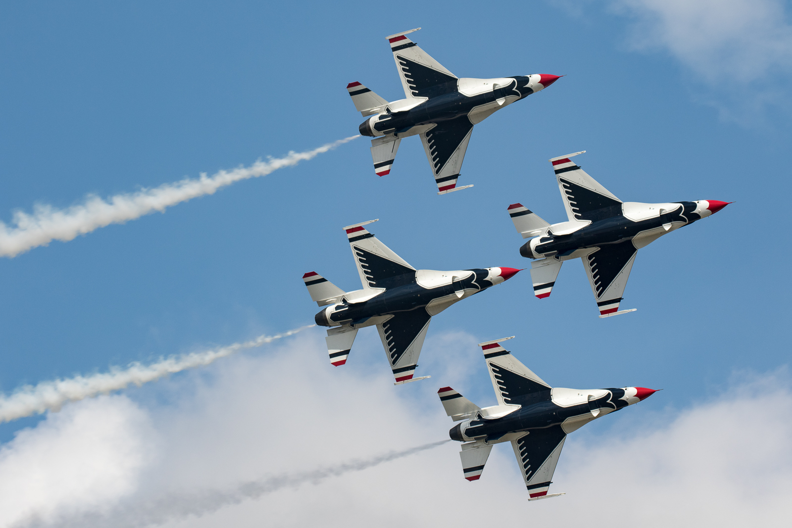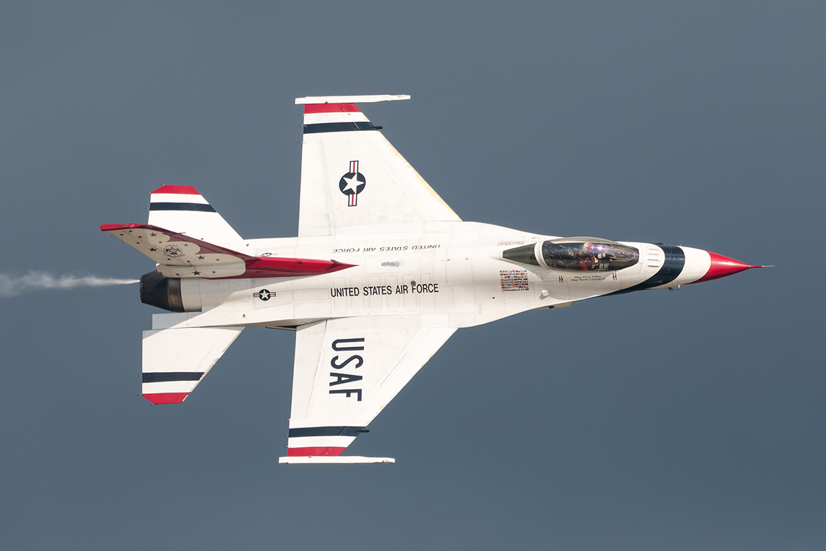 Closing the show was the USAF Air Demonstration Squadron, the Thunderbirds. Flying six F-16C’s, the entire performance lasts around an hour, although it is a good 35 minutes before the jets take to the air! Like the Raptor display, the Thunderbirds appeared slightly closer to the crowd line than their appearances at RAF Fairford, however the remainder of the display seemed unaltered with Thunderbirds 1-4 carrying out a number of formation moves whilst 5 and 6 carried out their precise synchro pair routine. It’s clear to see how well respected the team are by the crowd with everyone jostling for position to get the best view and, despite it being the final display of the day, they attracted by far the biggest crowd at the fenceline.