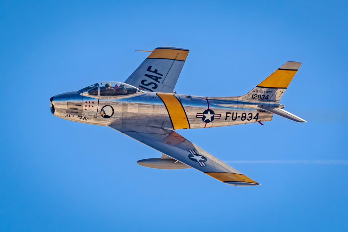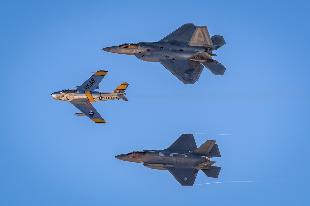 The penultimate section of the show was firmly focused on fast jets and comprised the US Navy F/A-18 Super Hornet TAC (Tactical) demo, the F-22 Raptor solo display and the Heritage flight of F-86, F-35 and F-22 aircraft. The Super Hornet demo was provided by VFA-122 ‘The Flying Eagles’ based at NAS LeMoore who used a F/A-18E single seater on the Saturday and a F/A-18F dual seat aircraft on the Sunday. Their display was similar to the Super Hornet display provided by Boeing often seen in the UK, making full use of the manoeuvrability of the type. Where the display differed was in the lower altitudes and higher speeds used in some of the passes and the carrier style approach and touch and go towards the end of the display.