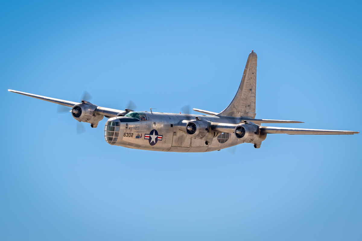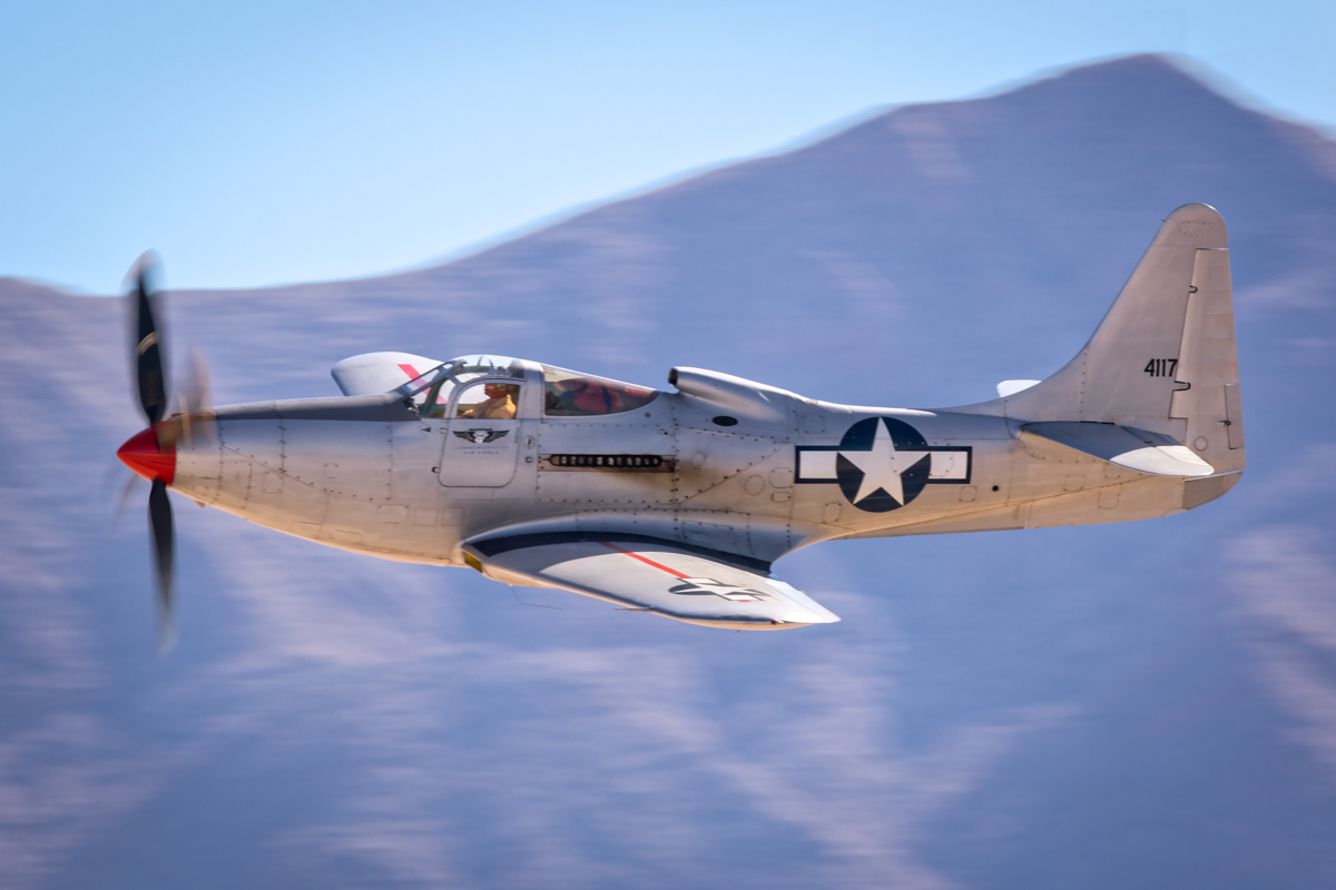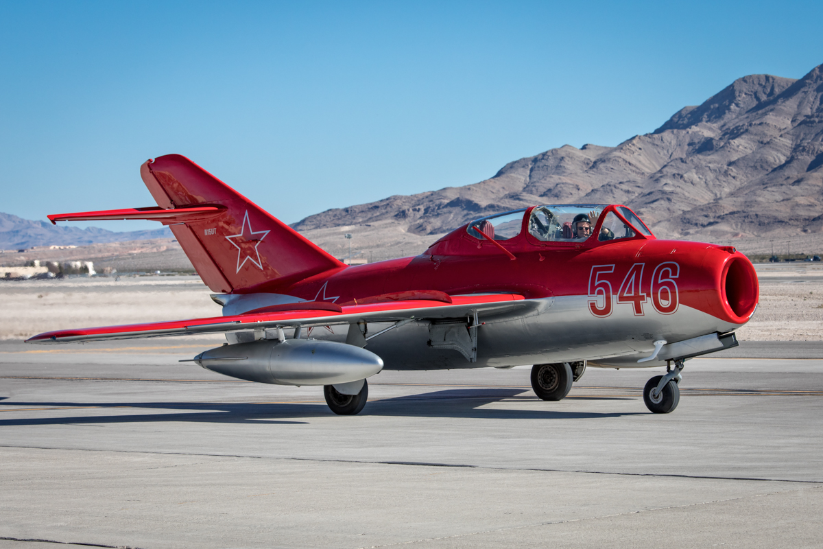 Next it was time for the Nellis Heritage Parade which was split into three themed sections, World War Two, the Korean War, and the Vietnam War. The parade started with World War Two types such as the ubiquitous T-6 Texan which was the first USAAF type flown at Nellis in 1941, P-40 Warhawk and a B-25 Mitchell ’Photo Fanny’. Also in this segment were two quite rare types in the form of a P-63 King Cobra and a PB4Y-2 Privateer; the latter being a highly modified B-24 Liberator with a single vertical tail and large observation windows which was used by the US Navy as a submarine hunter – much as the P-3 Orion and P-8 Poseidon are today. Following the World War Two segment came the Korean War section, which started with a pair of T-28 Trojans, a P-51D Mustang ‘Dolly’, an F-86 Sabre ‘Jolley Roger’ and the T-33 Shooting Star ‘Ace Maker’. The Korean section of the parade were chased around by a Mig-15 UTI in the really eye catching red and silver colour scheme of the 1950s Soviet aerobatic team The red Falcons.