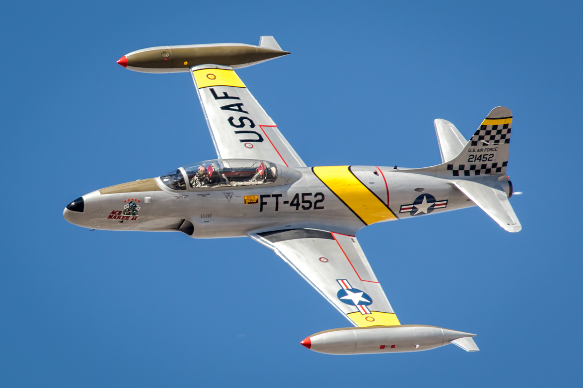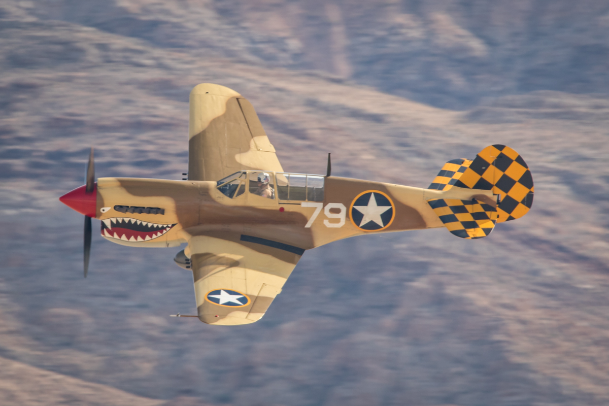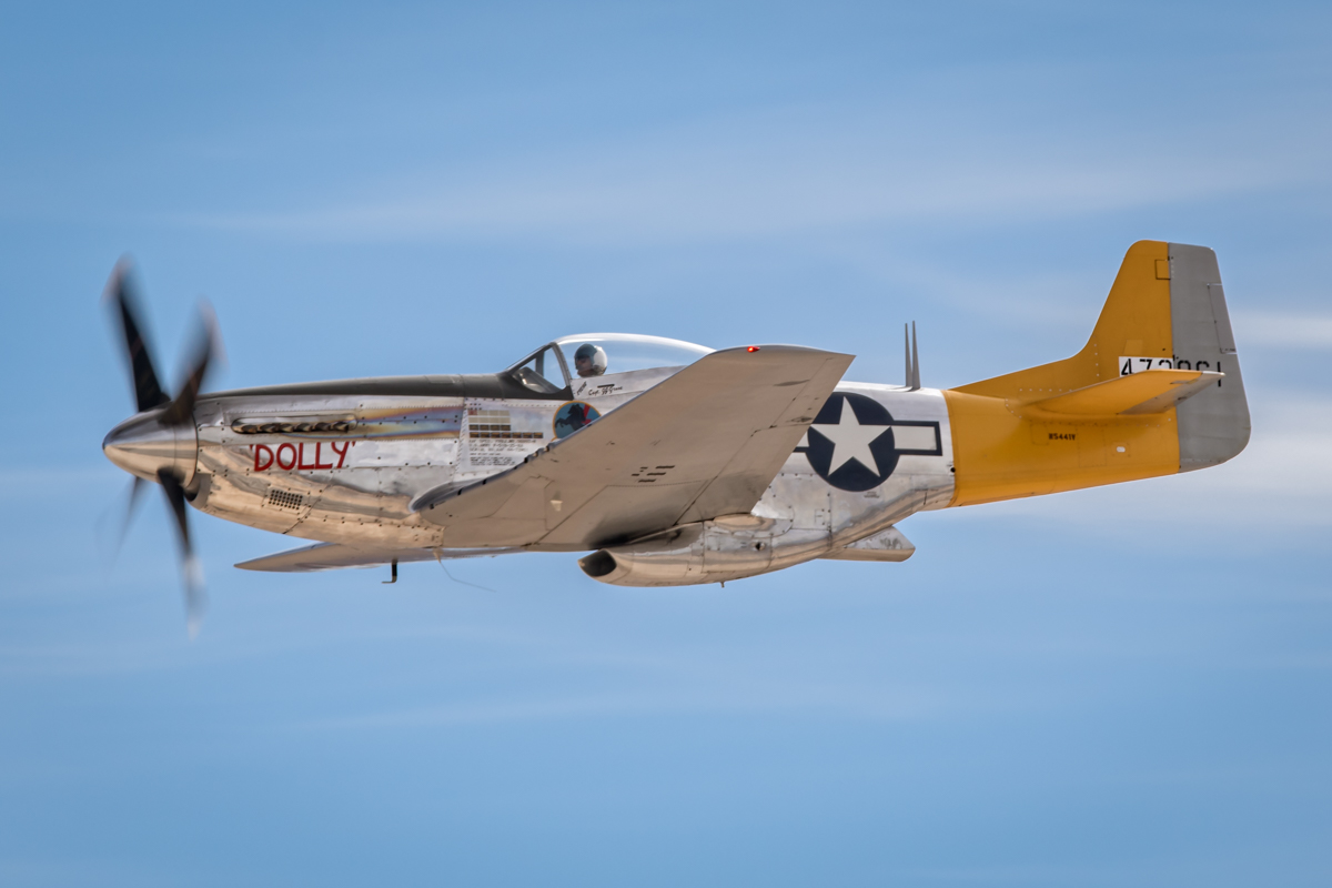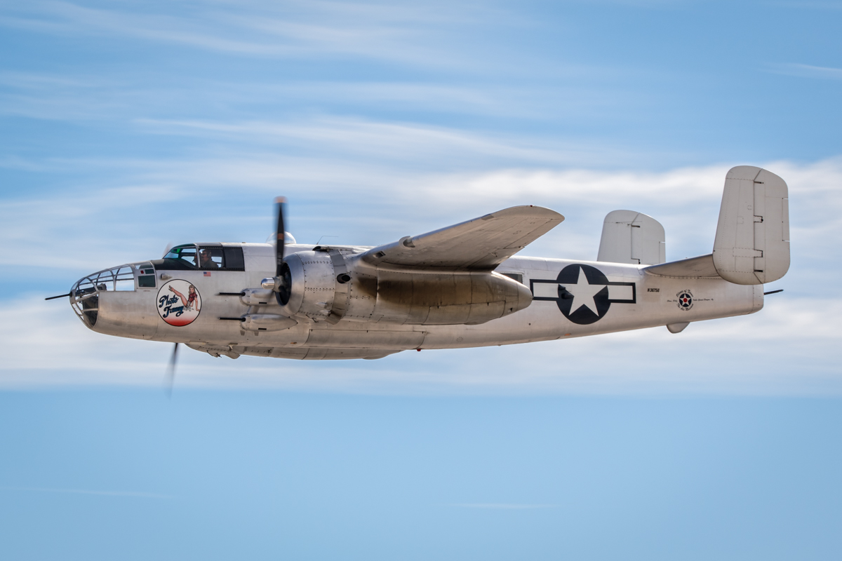 Next it was time for the Nellis Heritage Parade which was split into three themed sections, World War Two, the Korean War, and the Vietnam War. The parade started with World War Two types such as the ubiquitous T-6 Texan which was the first USAAF type flown at Nellis in 1941, P-40 Warhawk and a B-25 Mitchell ’Photo Fanny’. Also in this segment were two quite rare types in the form of a P-63 King Cobra and a PB4Y-2 Privateer; the latter being a highly modified B-24 Liberator with a single vertical tail and large observation windows which was used by the US Navy as a submarine hunter – much as the P-3 Orion and P-8 Poseidon are today. Following the World War Two segment came the Korean War section, which started with a pair of T-28 Trojans, a P-51D Mustang ‘Dolly’, an F-86 Sabre ‘Jolley Roger’ and the T-33 Shooting Star ‘Ace Maker’. The Korean section of the parade were chased around by a Mig-15 UTI in the really eye catching red and silver colour scheme of the 1950s Soviet aerobatic team The red Falcons.