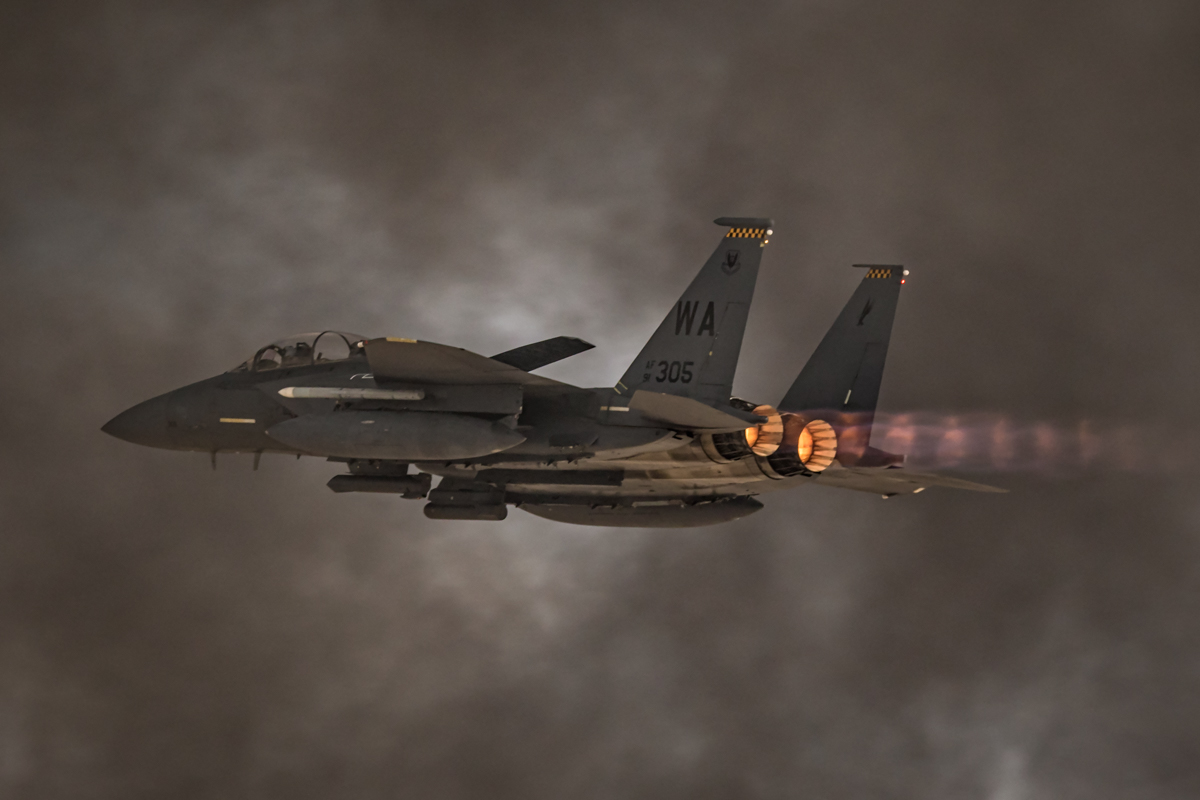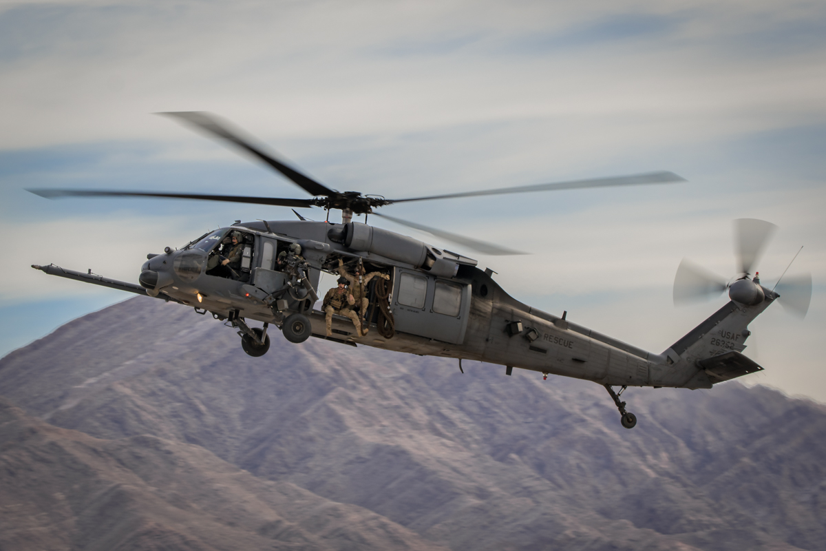 The Air to Ground demo followed immediately afterwards, starting with a group of joint terminal attack controllers (JTAC) taking to the airfield in two lightweight tactical all-terrain vehicles (LTATV). These JTACs called in air strikes simulating a special forces contact with insurgents, using a pair of F-15E Strike Eagles and a pair of A-10C Thunderbolt II aircraft also from the 57th Wing. After the initial ground attack runs, two HH-60G Pave Hawk helicopters enter the fray to insert and extract personnel using fast roping and winching operations. Both of these displays were fast-paced, dramatic and made good use of flares dropped over the more remote parts of the field. Both the Air to Air and Air to Ground demos effectively demonstrated the air power which is resident at the base as well as the highly realistic training environment which is provided by the 57th Wing for use by the USAF, air arms from NATO and other partner nations.