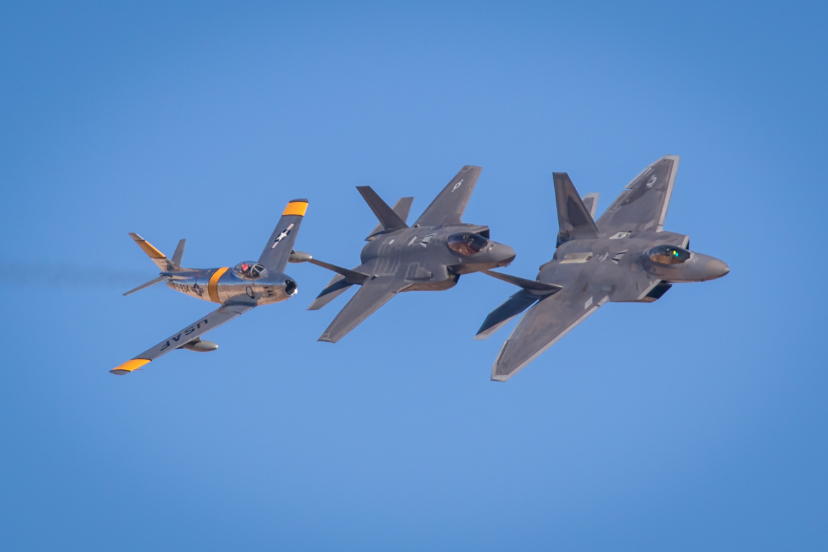 The Super Hornet was followed by the take off of the F-86 and F-35 which went off to hold until their slot following the F-22 solo display. The F-22 Raptor then performed a high performance take off straight into a series of astonishing manoeuvres which are the hallmark of the F-22 solo displays. Back this year was the Hoover Pitch which commemorates the passing of the elite airshow performer and aviation legend Bob Hoover. This manoeuvre sees the Raptor perform a series of knife-edge passes linked by aileron rolls which are reminiscent of Bob Hoover’s famed Shrike Aero Commander displays. The F-22 certainly made good use of the scenery in its display turning in front of the amazing landscape and at one point appearing to skim the top of one of the mountain peaks. For the finale, the F-22 joined up with the other two heritage flight aircraft and the three performed a series of passes together, culminating in a pass from behind the crowd and a nice break over crowd centre. Before landing the three aircraft performed some missed approaches with the F-35 performing some high performance manoeuvres, that have been rarely seen at airshows thus far by this relatively new type (currently the F-35 is only displaying as part of the Heritage Team and has yet to be authorised to perform a true solo display).