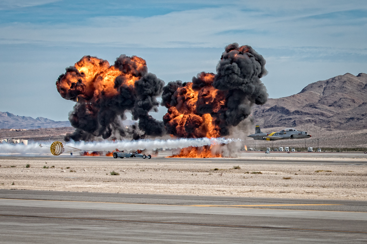 Following the Phantom was Gregory W Colyer in his T-33 Shooting Star ‘Ace Maker’ back for his solo display after flying earlier as part of the Korean War segment of the heritage parade. This was a very accomplished routine combining very low passes along the runway with high performance manoeuvres using every inch of sky. At the end of the sequence ‘Ace Maker’ was joined by the Jet Car ‘Smoke ‘n’ Thunder’ which resembles a top fuel dragster style of vehicle combined with a Westinghouse J34 turbojet (formerly fitted to a T-2 Buckeye) for smoky, flaming power. ‘Smoke ‘n’ Thunder’ lined up on the runway and was joined low overhead by ‘Ace Maker’ with precision timing to start the race. ‘Ace Maker’ inevitably won this race which was framed by several explosions behind the pair which added to the spectacle.