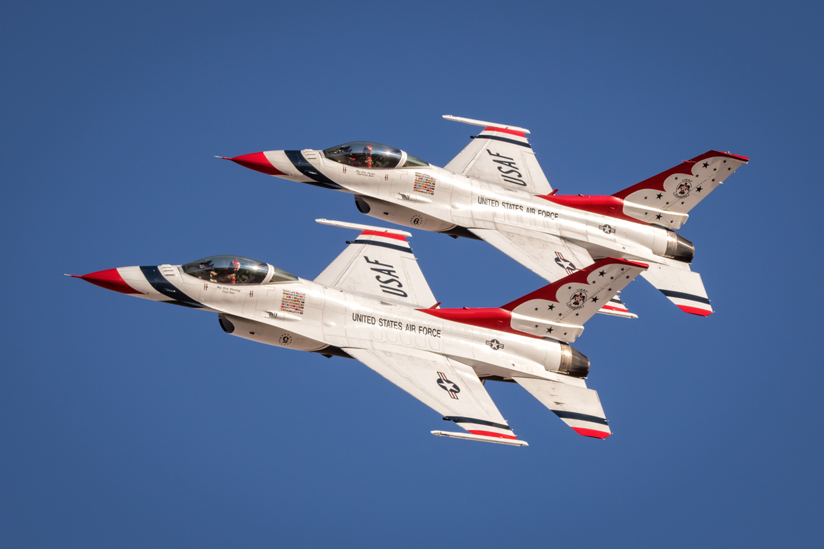 The final display of Aviation Nation was from the US Air Force aerial demonstration team The Thunderbirds. The Thunderbirds display starts with a 30 minute ground show which takes place at show centre where the Thunderbirds are lined up throughout the display. The routine which includes the pre-flight checks and start-up of the aircraft can seem a little laborious for those used to European teams who are waiting at the end of the runway when the previous display lands, but as always they are well worth the wait. The 6 ship display is precise, well timed and makes full use of the performance of their Block 52 F-16 C and D model jets.