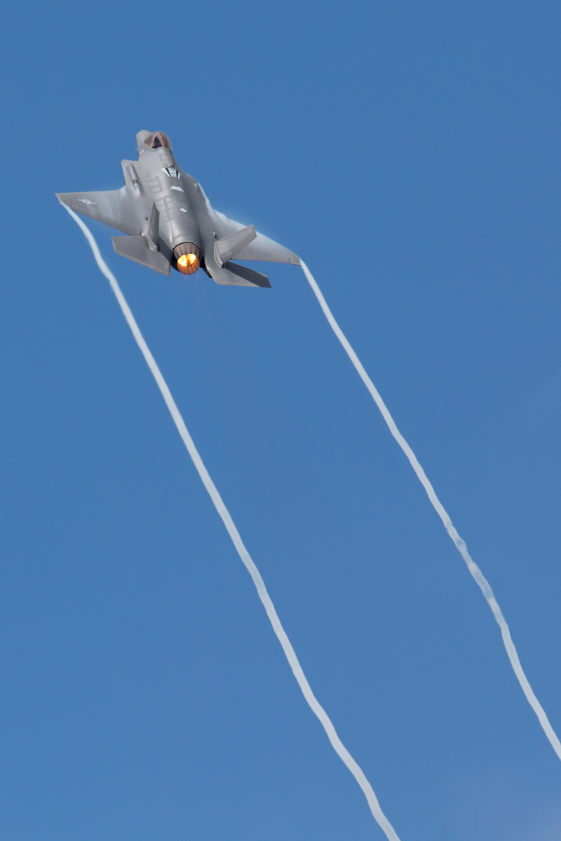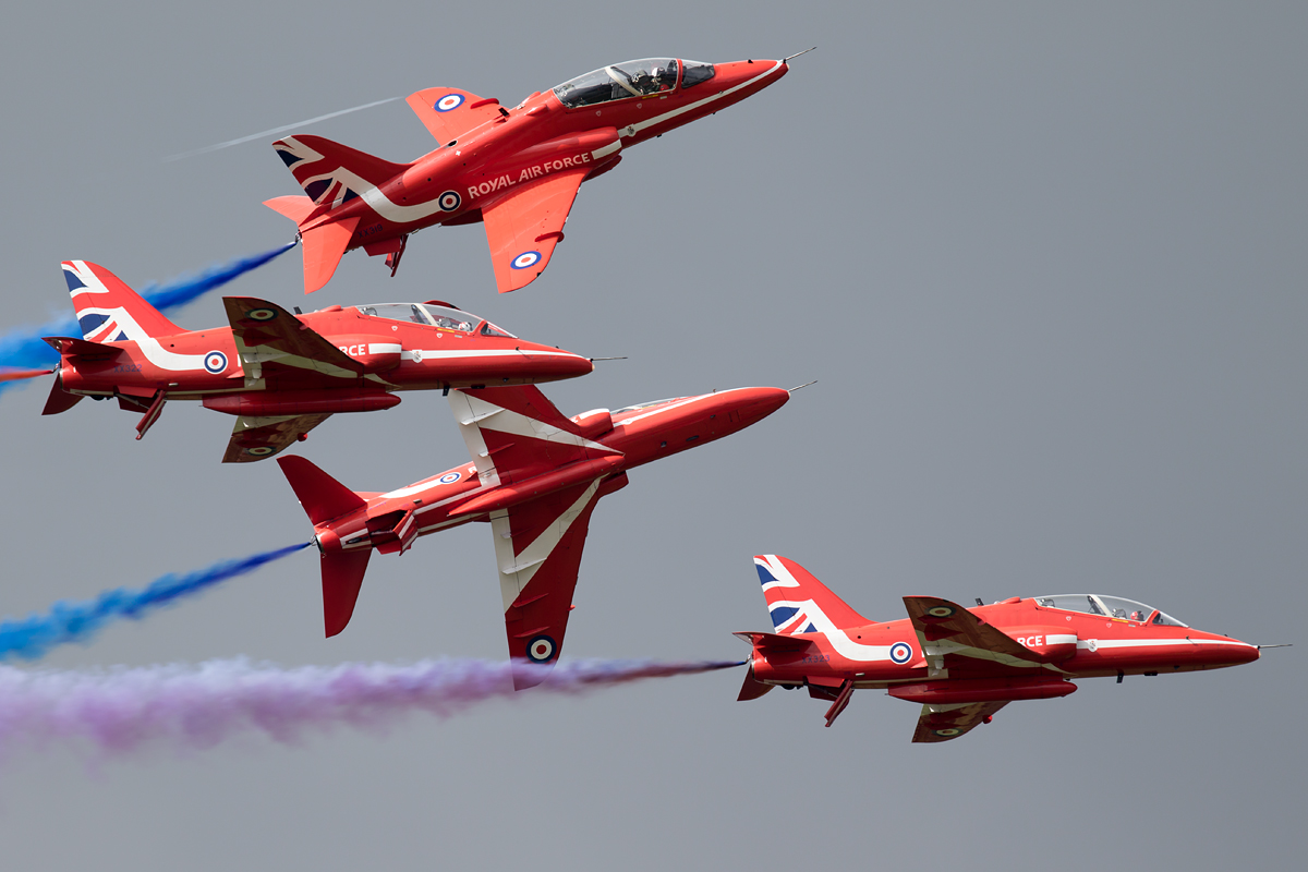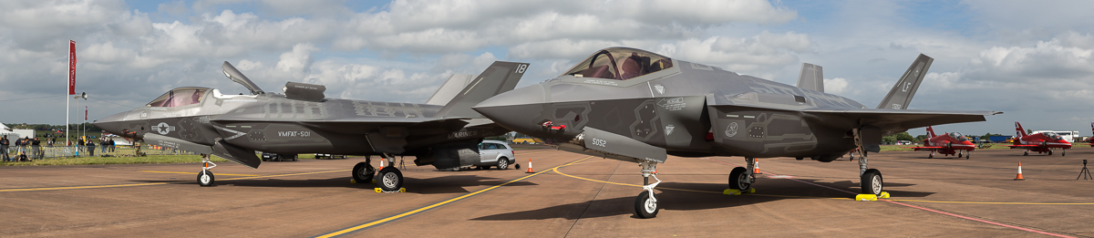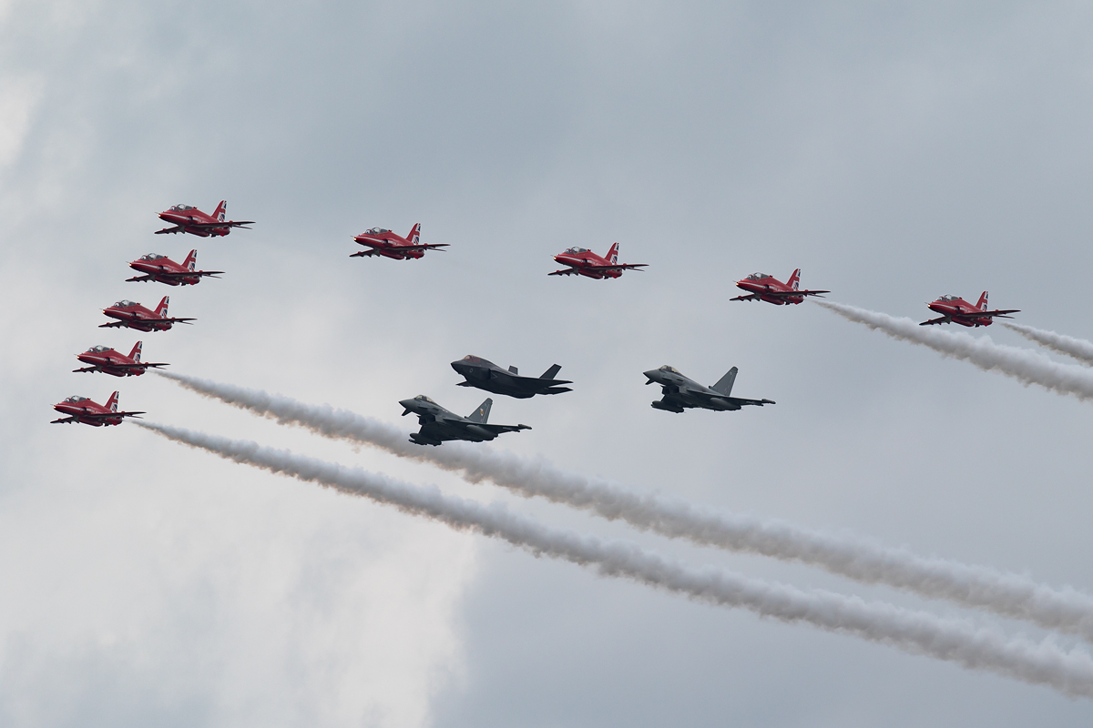 Fortunately, the USAF weren’t the only air arm showing off their latest fifth-generation toys and the headline act of RIAT 2016 was always going to be the first international demonstration of the F-35B. Of the three aircraft that made the transatlantic crossing, one was a fully marked RAF development aircraft (ZM137 better known as BK-3) while the remaining two were US Marine Corps (USMC) examples operated by VMFAT-501 ‘Warlords’. When compared to the the Harrier displays of yesteryear that UK airshow goers were once familiar with the solo display is nowhere near as fully developed, consisting only of a number of fast passes and a minimum radius turn. However, when demonstrating its hovering party trick, the innovative multi-role aircraft did not disappoint. Prior to the event, the Royal Engineers and USMC had constructed a heat resistant landing pad allowing the F-35B to finish its display with a vertical landing in front of the crowd. RAF Display pilot Squadron Leader Hugh Nichols brought the aircraft into a remarkably stable hover, especially considering the gusty crosswind blowing throughout the weekend, and gently descended on to the pad using an abundance of thrust from the primary nozzle and forward lift fan. The aircraft was surprisingly well received considering the extent of negative press associated with the program, and many people went away as F-35 converts as a result of the display. A UMSC F-35B also participated in an air-to-air refuelling demonstration with a USMC KC-130J Hercules on the Friday, and was the centrepiece of the now traditional ‘showstopper’ formation with the Red Arrows on each day of the show, flanked by a pair of Eurofighter Typhoons from RAF Lossiemouth based 1(F) Sqn (albeit a single Typhoon on the Saturday). It is great to see this tradition of unique Red Arrows formations continuing, although it would have been nice to have seen more than a single pass from the assembled aircraft.