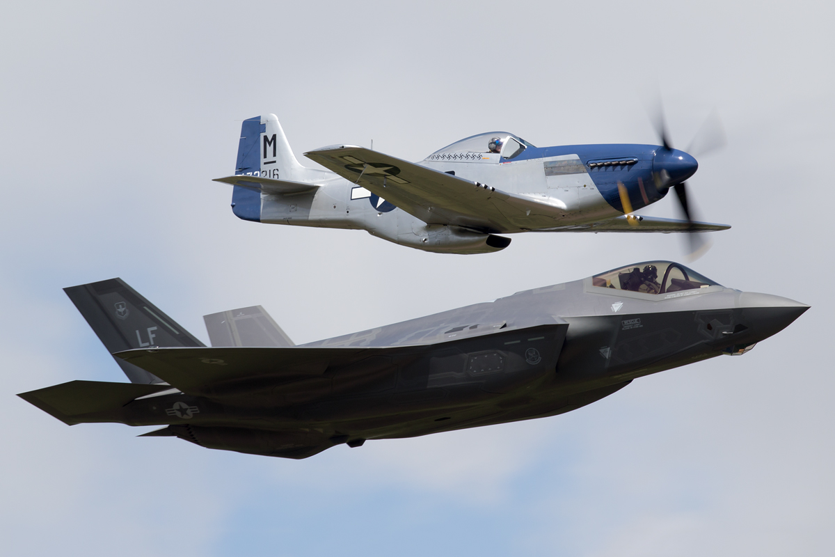 In sharp contrast to the ageing soviet-bloc lines of the MiG-29 were the two fifth generation fighters on display. 2016 saw the welcome return of the USAF F-22A Raptor which amazed as ever with its physics-defying vectored thrust manoeuvres. This superb aerial ballet was enough to earn the F-22A Demonstration Team the FRIAT ‘As the Crow Flies’ Trophy. Unfortunately, on the Sunday the display aircraft suffered a technical problem shortly after the start of its display forcing Major Dan ‘Rock’ Dickinson to make a precautionary landing. As compensation for the shortened Raptor display, the USAF gave the audience more of a chance to see its newest combat aircraft: the F-35A Lightning II. The F-35A is not currently on the solo display circuit, and was at Fairford to participate in a daily Heritage Flight. Pleasingly, to fill the time gap left by the curtailed F-22 display, Major Will ‘D-Rail’ Andreotta flew a number of circuits before joining up for the Heritage Flypast. The USAF did not have too much luck with their flypast intentions over the whole weekend. Originally billed as a formation of F-22A, F-35A and P-51D, the complete formation was not seen on any of the three show days as a result of strong winds preventing the Mustang travelling from Duxford on Friday and Saturday followed by the F-22 technical issue on the Sunday. As with all US Air Force display items the overly patriotic commentary detracted from otherwise impressive demonstrations – the Heritage Flypast performing to the wonderfully emotive ‘We Remember’ by Dwayne O’brian. Unlike European teams like the Frecce Tricolori or Patrouille Suisse which provided some of the most entertaining commentary of the weekend, one gets the impression that the USAF commentators rely rigidly on a script and cannot improvise for unusual situations.