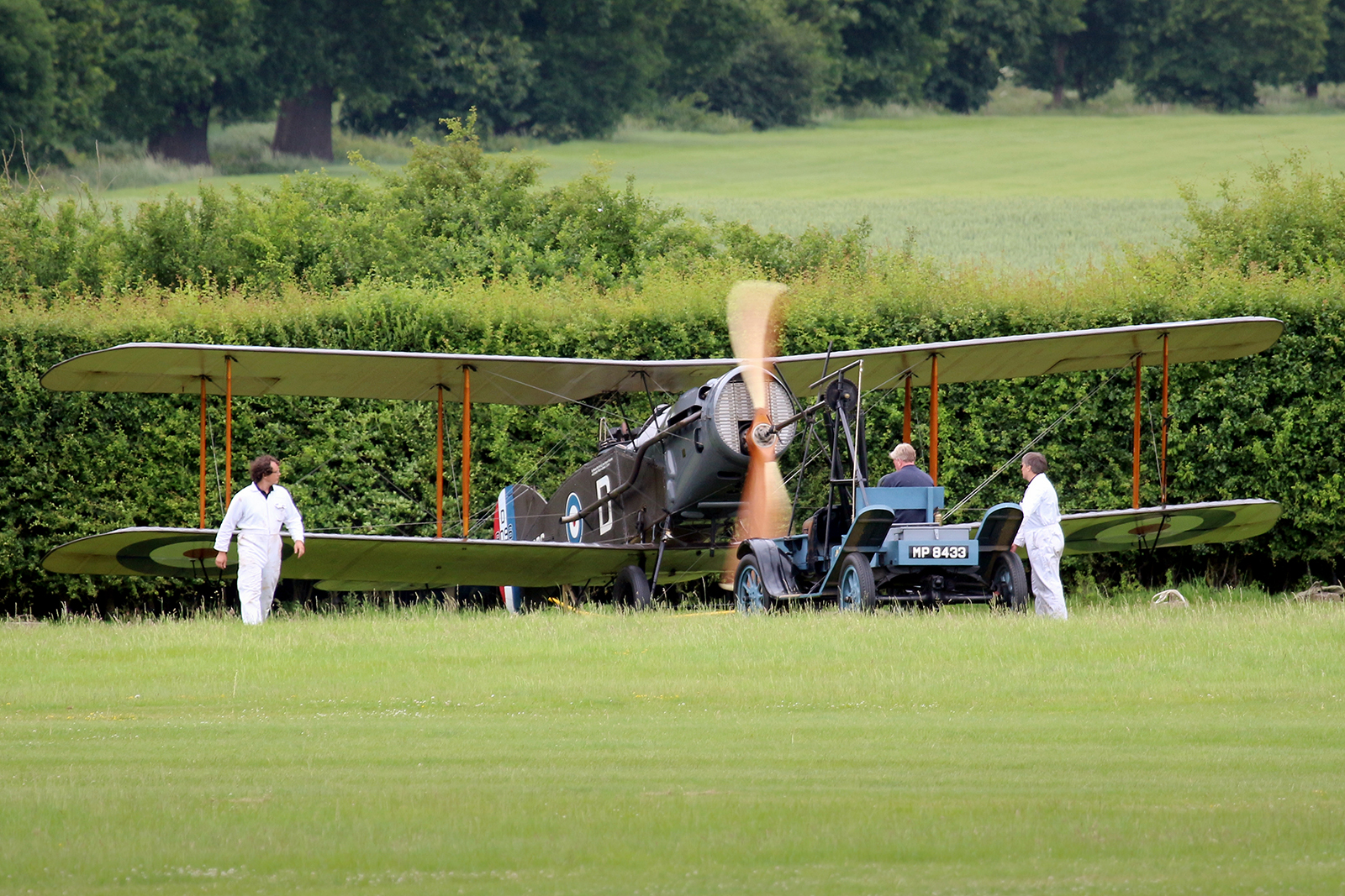 Unfortunately, during the final pass of the ‘Balbo’, the Collection’s Gloster Gladiator was quite evidently struggling – coughing, smoking and spluttering its way down the display line which eventually resulted in the old lady peeling away and making an emergency landing in a nearby field. Fortunately the pilot was not harmed and no damage was sustained to the aircraft. In fact the only damage sustained at all was that inflicted on the trees that needed to be removed to allow the Gladiator back onto the airfield from the adjoining field that night! The incident was extremely well handled by the Shuttleworth organisers who kept the crowd aware of the ongoing situation while the Lysander circled overhead the stricken aircraft. When an update on the condition of both the aeroplane and pilot was announced it was greeted with a huge applause from the crowd.
