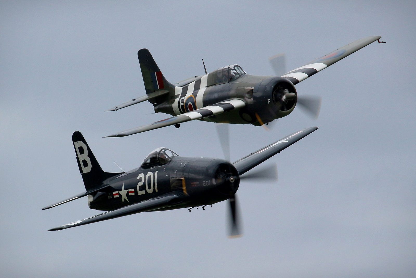 Not to be outdone by their British counterparts, the two aeroplanes from across the pond, both from the Grumman stable, were on hand with more powerful and aggressive, yet equally as impressive, displays. Seldom seen away from their Duxford home, The Fighter Collection’s (TFC) F4F Wildcat and F8F Bearcat flew a ballet like pairs display before splitting up for energetic solo efforts showing off their outright raw power – the Wildcat’s reciprocating Wright engine purring away while the Bearcat’s Pratt and Whitney unit snarled as they dragged these machines through their slots. The wilder of the two cats could also be heard drawing a faint, yet spine tingling, whistle as Dave Southwood cavorted with it through the menacing skies. With the FAA historically operating the Wildcat – or Martlet as it was known in Royal Navy service – it was rather fitting that the TFC machine wears the colours of an 846 Naval Air Squadron example while flying from HMS Tracker in 1943.