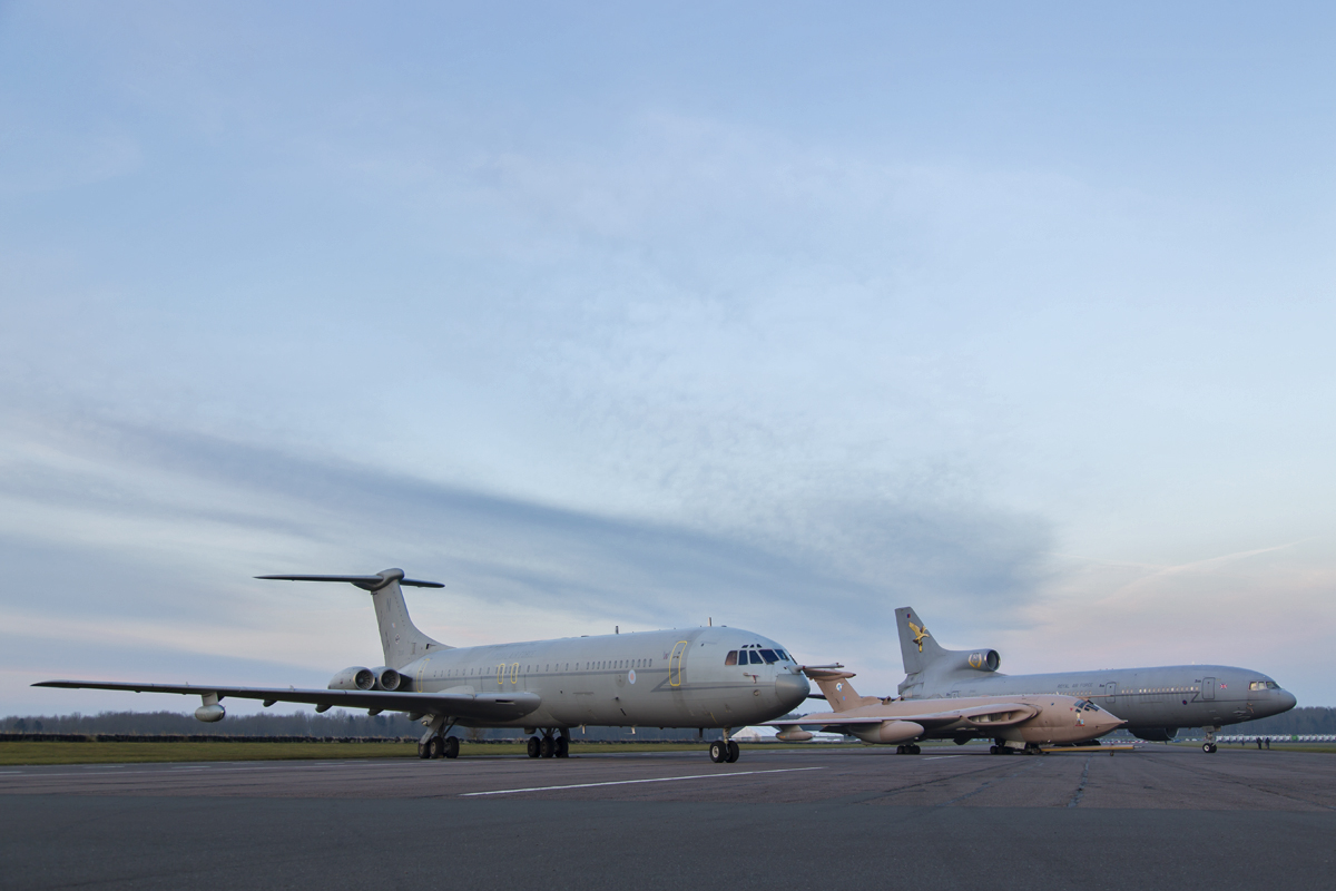The intention was to position the VC-10 for good photography in what remained of the daylight (whilst sunny, a constant and strengthening haze blanketed the airfield), and then bring its compatriots alongside. A great idea in practise, but the difficulty of positioning an aircraft perfectly for a photo required some later minor adjustments – minor in this sense being a relocation several hundred feet further along the runway.