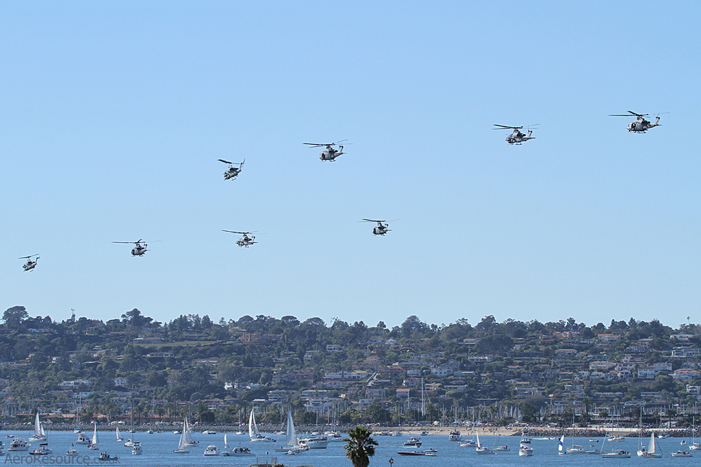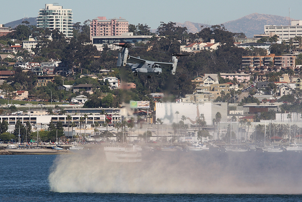 The Marine Corps demonstrated a version of its much loved Marines Air Ground Task Force demonstration, filling the sky with helicopters and jets. The Coast Guard demonstrated its Search and Rescue role and as the two hours passed by in what seemed like minutes, we were all treated to over two hundred aircraft in the once-in-a-lifetime review. For the finale, The John C Stennis air wing (CVW-9) appeared in a large formation from over the Pacific Ocean. It comprised of 29 x F-18 Hornets, 3 x EA-6 Prowlers, 2 x E-2 Hawkeyes and 1 x C-2 Greyhound. The formation flew slowly over the crowd and disappeared over the heart of San Diego, a very fitting tribute and end to a very special day.
