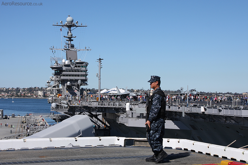 A short walk or bus ride across the Naval Air Station allowed members of the public the opportunity to view first hand one of the most impressive ships ever built, the Nimitz-class nuclear-powered Supercarrier, John C Stennis (CVN-74). Commissioned on 9th December 1995, the $4.5 billion Carrier is expected to patrol the oceans for 50 years as part of the Carrier Strike Group Three. The ships length is a staggering 332.08 meters and thanks to two Westinghouse A4W nuclear reactors, it can run at 30 knots for 20 years. On 26th February 1998 the John C Stennis made her maiden deployment to the Persian Gulf. Sailing an impressive 8020 nm in 274 hours she relieved the USS George Washington in conducting Operation Southern Watch missions. On returning from the deployment, the John C Stennis arrived at her new home port of Naval Air Station North Island on the 26th August 1998. Since then she has been deployed to the Persian Gulf and Pacific Ocean a further 5 times with her Air Wing, CVW-9.