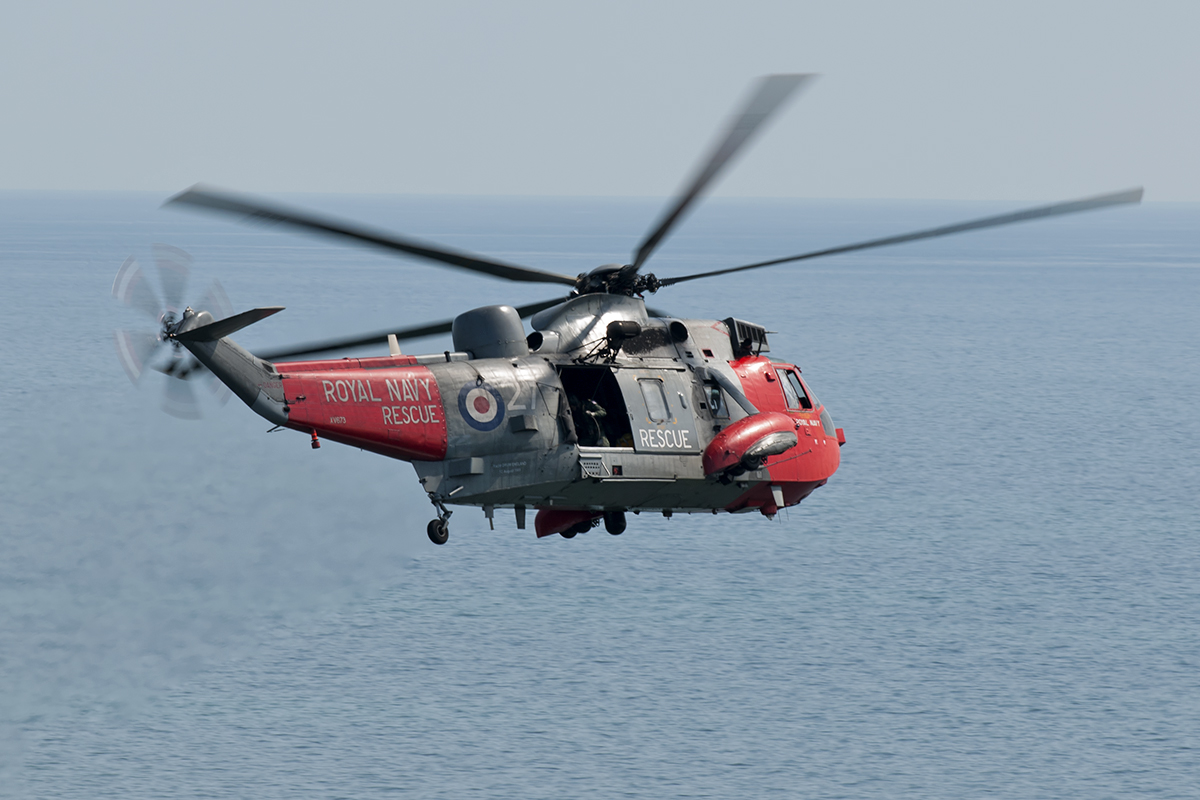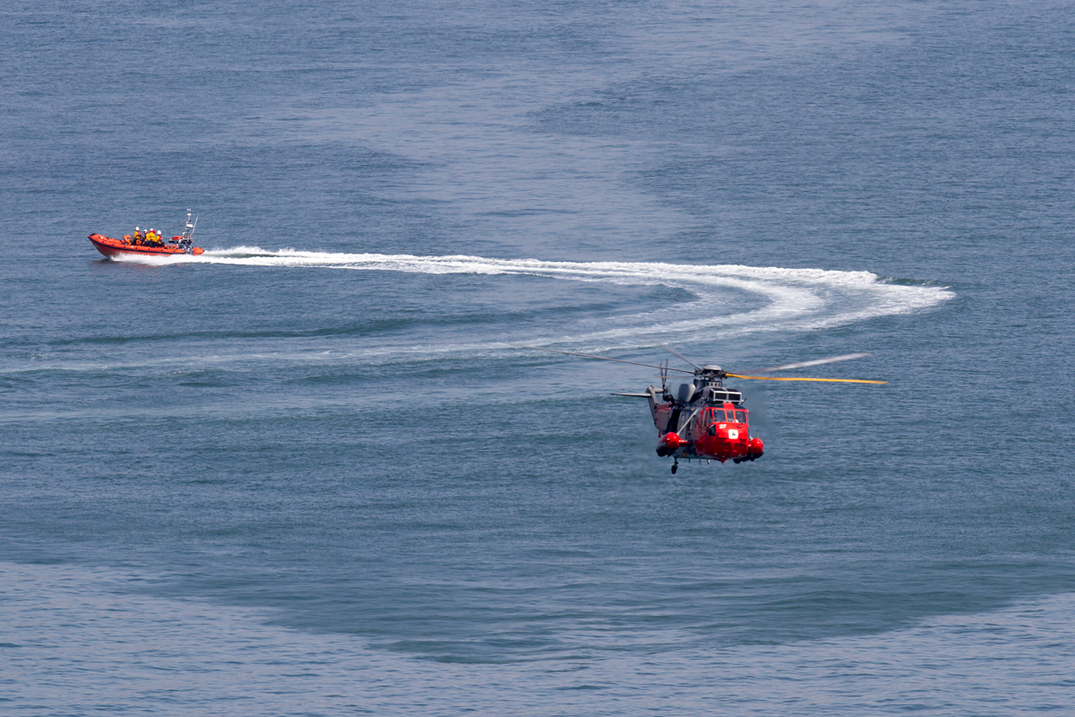 With the military Search and Rescue (SAR) Sea King helicopters in the twilight of their careers, it was to great delight that the Royal Navy provided a SAR demonstration in conjunction with a HM Coastguard Rigid inflatable Boat. The 771 Naval Air Squadron Sea King from its base at RNAS Culdrose in Cornwall had been operating from the temporary helicopter landing ground at the Smugglers Inn giving air experience flights to the Sea Cadets prior to launching for its role demo which featured a number of photogenic passes over the flat, calm sea.