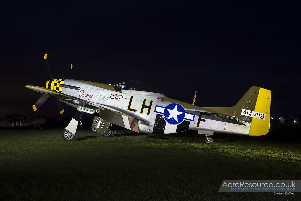 The first Mustang to join the collection was P-51D ‘Janie’ which carries the codes 414419/LH-F and is registered as G-MSTG. Built in 1945, the aircraft was immediately shipped across to the Royal New Zealand Air Force where it would spend its 10 years in service as NZ2427. Once retired from service, the aircraft was purchased by two private individuals. Maurice acquired the aircraft in 1997 and had it shipped back to the UK before a total restoration took place and, on 13th July 2001, NZ2427 returned to the skies. The livery it carries today, with a green topside and yellow and black nose, represents an aircraft flown by Major Bill Price from the 350th Squadron, 353rd Fighter Group.