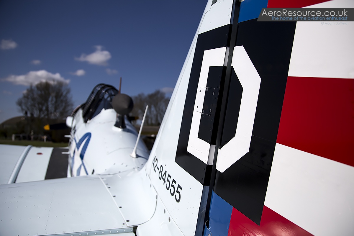 The Mustangs are the most well known of the collection however thats not to say that the others are any less interesting or important. Infact, in the authors opinion, the AT6-D Texan ‘Fools Rush In’ is the best looking example in the UK and, having been off the display circuit for a few years, a rarity for many to see. Originally ordered in 1942 and delivered to the Fleet Air Arm two years later, it saw service with the Royal Navy as EZ341 until 1956 when it was subsequently purchased by the Portuguese Air Force with whom it continued to serveuntil 1973. Restored between 1992 and 1994, it carries a scheme representing a hack aircraft of the 100th Bombardment Group based at Thorpe Abbotts – something symbolised by the ‘Square D’ insignia on the tail which will be familiar to many modern military spotters along with a plaque dedicating the aircraft to that unit.
