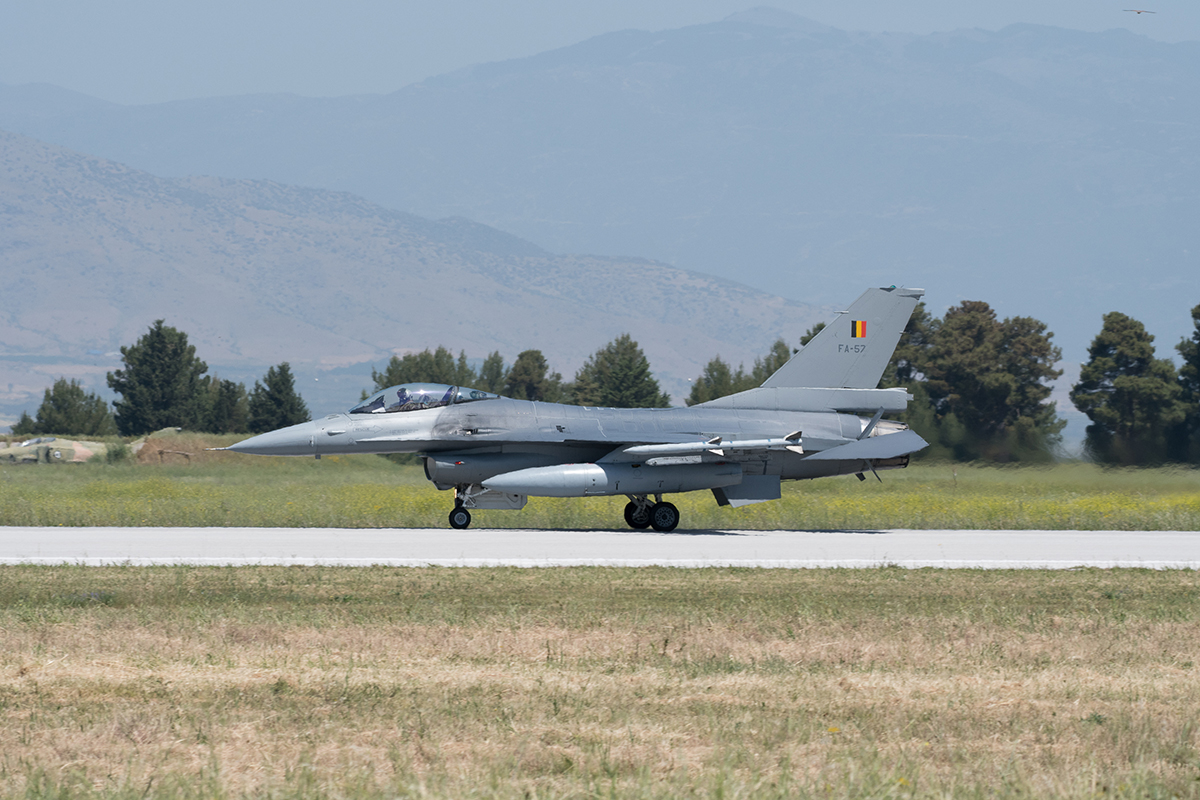 Just before 1000 the remaining Recce Phantom 69-7499, freshly painted in a striking black and orange retirement scheme for the aircraft and 348 Squadron, launched to the east. Shortly afterwards two of the F-16’s (F-16C 508 & F-16D 600) that had launched earlier carried out a simulated airfield attack, running in from the North before departing out to the East. A further two F-16Cs (coded 532 & 507) departed to the East but this time both armed with live AMRAAM and IRIS-T missiles, before the morning flight of Vipers recovered and a single F-16D (coded 619) departed to the West. These were shortly followed by 69-7499 landing, which once again paraded down the length of the southern taxiway for the waiting photographers. Two visiting Belgian F-16AMs also arrived (coded FA-57 and FA-97) just after midday to spend the afternoon with 348 MTA and were swiftly followed by a visiting HAF Mirage 2000-5 (coded 505) conducting an overshoot before departing back to 331 Mira Tanagra AB.