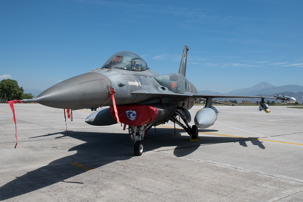 The enthusiast event effectively allowed the gathered photographers to view and record the events of an operational day at Larissa and the first launch of the day got under way at 0900 seeing two RF-4Es (77-1765 and 69-7450) power off on the easterly runway followed by four Block 52 Hellenic F-16Cs and a single F-16D (coded 531, 524, 508 & 600 respectively) from the resident 337 ‘Ghost’ Squadron. The Phantoms did one overflight of the airfield prior to the first aircraft (77-1765) landing on the westerly runway whilst 69-7450 performed a go around giving the opportunity of a rare topside pass against a glorious blue sky. Both aircraft then taxied the length of the taxiway pausing to allow the assembled photographers the chance to capture each of them.