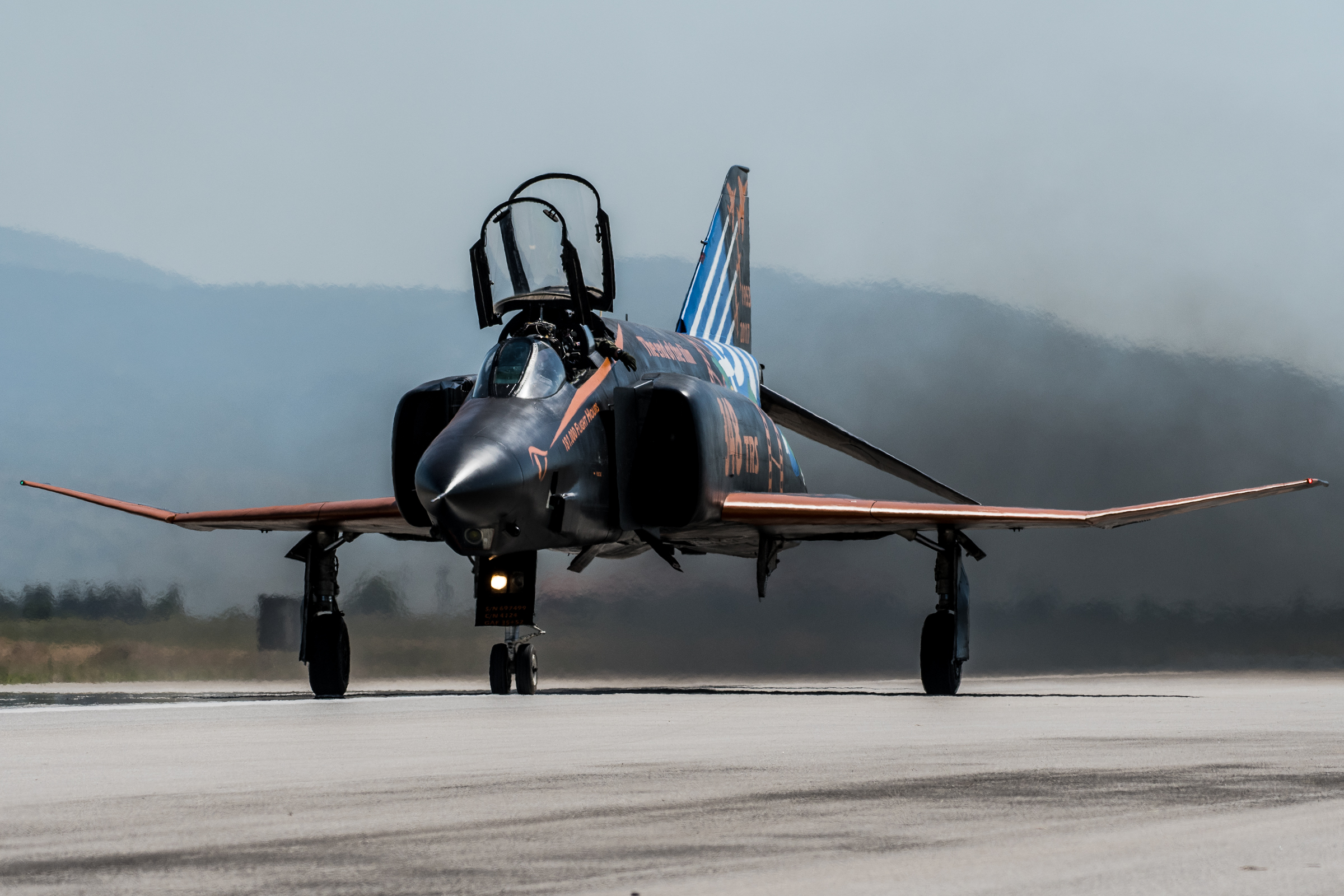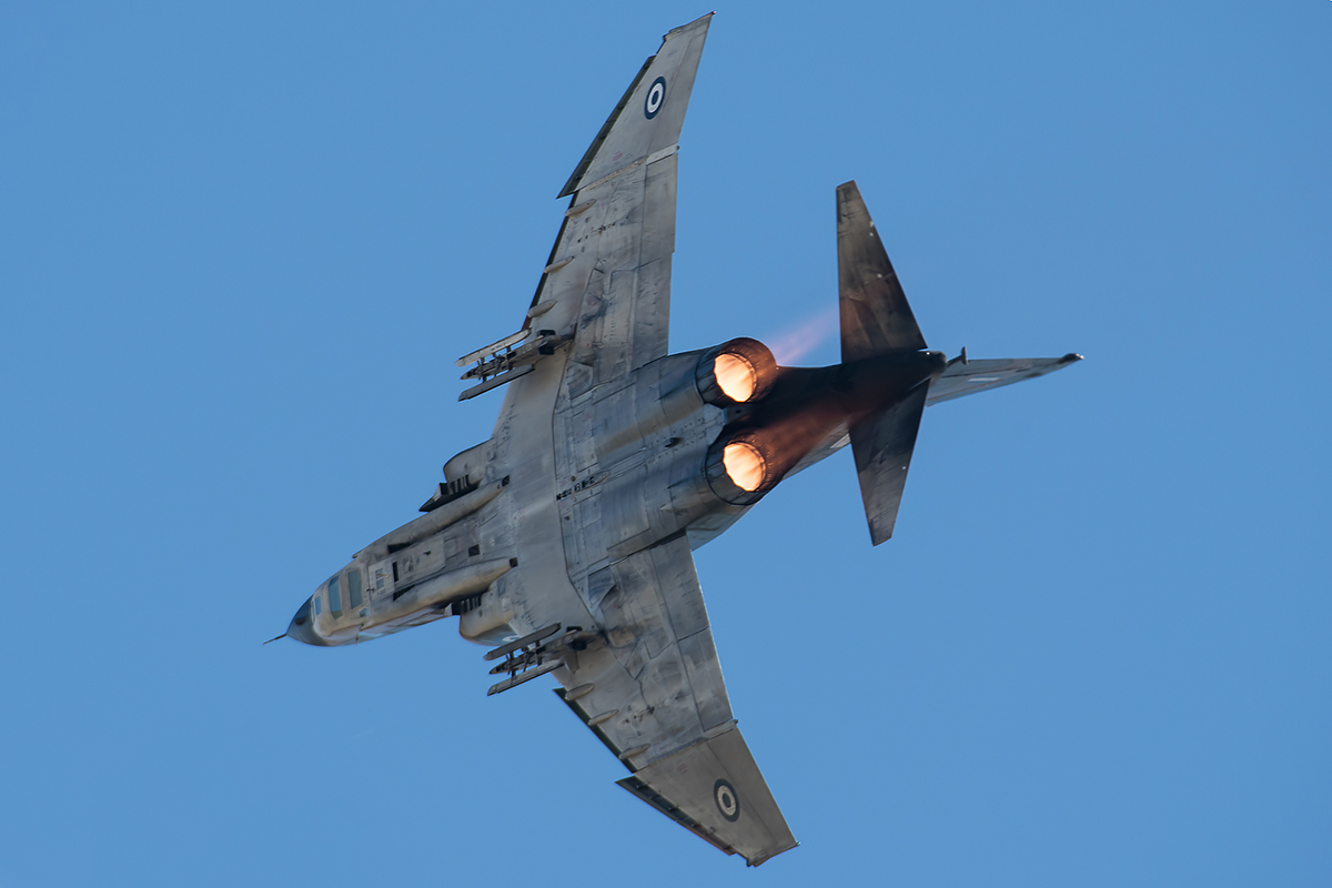 The new build tandem seat McDonnell Douglas Phantom RF-4Es for the HAF were based on the already well known supersonic F-4 Fighter Bombers in service with various military operators throughout the world including the UK, USA, Spain, Japan, Germany and Australia. The F-4’s were powered by two General Electric J79 engines, with exception of Phantoms used by for the Royal Navy and Royal Air Force in the UK which had Rolls Royce Spey engines fitted. The J79 engines were responsible for a series of world records held by the F-4 including one on August 28, 1961, where a F4H-1F Phantom II averaged 1,452.777 KPH (902.714 miles per hour) over a 3 mile (4.82 km) course flying below 125 feet (38.1 m) at all times! The Phantom is very recognisable at a distance due to the dense smoke trail left in its wake by the hungry J79 engines.