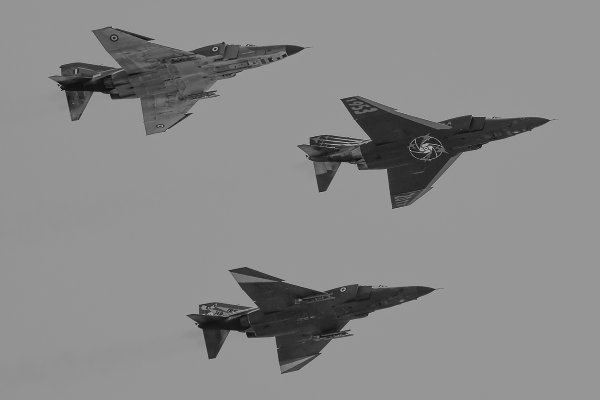 Some 40 minutes later the distinctive black smoke emanating from the six powerful J79 engines in the distance heralded the imminent arrival of the formation flypast. On arrival, the F-16 and Mirage 2000 peeled away to leave the three Phantoms to conduct a wide circuit around for their final break overhead the assembled mixture of dignitaries, guests, squadron personnel, locals and enthusiasts.