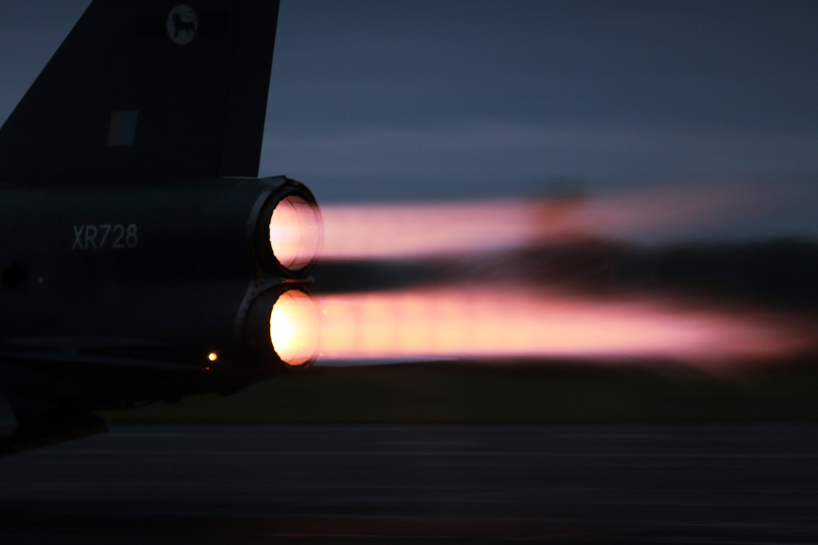 With the ‘Q-jets’ ready and ‘cocked’, the last twinges of day slowly disappeared into night and with a 10,000ft runway at their disposal, the scene was soon set. Before long, the air was alive with the alert bell ringing and the yells of the crews. Within seconds came the rattle of the Q-Shed doors being hurriedly opened before the shriek of an AVPIN starter pierced the air as the first jet came alive – John Ward doing the honours as ‘Q1’ in XR728/JS. Bare essential checks carried out, a quick flash of the landing lights and the jet was soon on its way along the taxiway to the runway before plugging both afterburners in and plunging into the darkness – no less than two minutes after the call to ‘Scramble’!