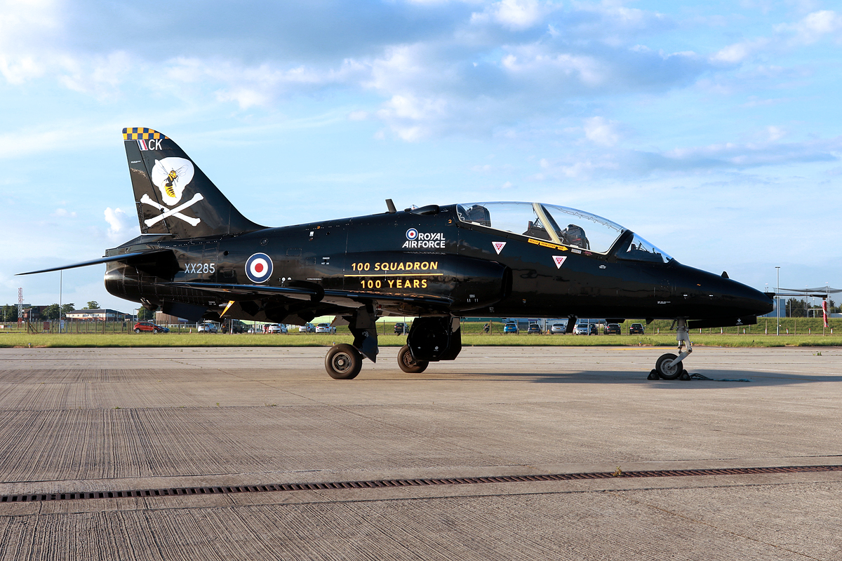 The final visiting aircraft came from RAF Leeming and yes another centenary schemed example! Representing 100 Squadron, BAe Hawk T.1 XX285 still retains its overall operational black scheme but with the addition of a blue and yellow checkerboard marking across the top of the tail and a prominent skull and crossbones with a hornet over the skull. The former represents the Squadron badge and the latter the Squadron motto – Sarang tebuan jangan dijolok, which is Malay for ‘Never stir up a hornet’s nest.’