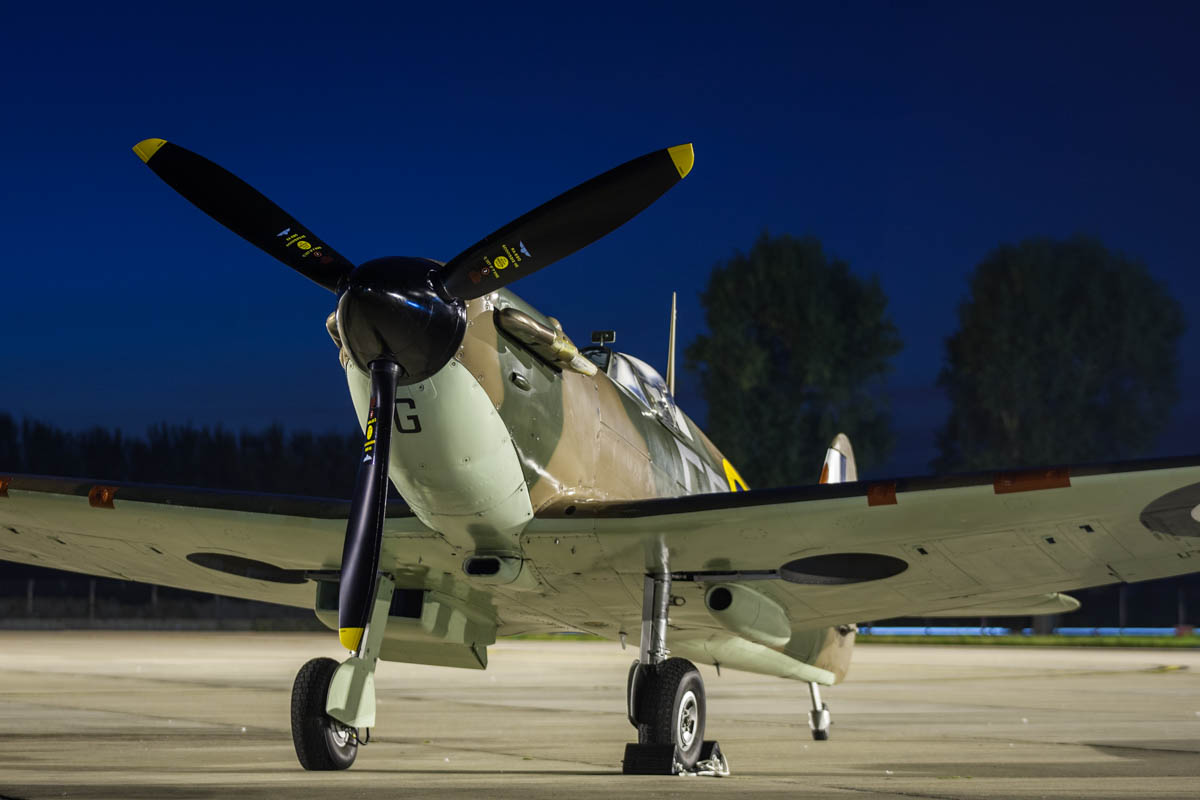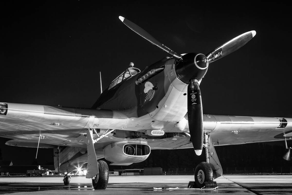 While we had been shooting the Tornado, the 41 Squadron Typhoon had been floodlit, but sadly, it was to be the next victim of the tug, being removed from the line not long after being illuminated. One cannot criticise too heavily on this, being that they are operational jets on a frontline base, however, as they were two of the star items in the line up perhaps an extra thirty minutes wouldn’t have gone amiss. The next airframes to be the subject of attention was the ‘Hurriphoon’ & Hurricane, with the pan being wet down by the station fire service at the request of the photographers.