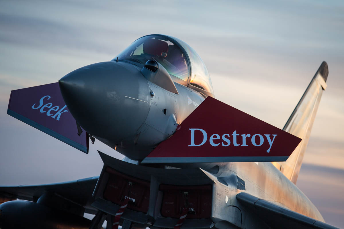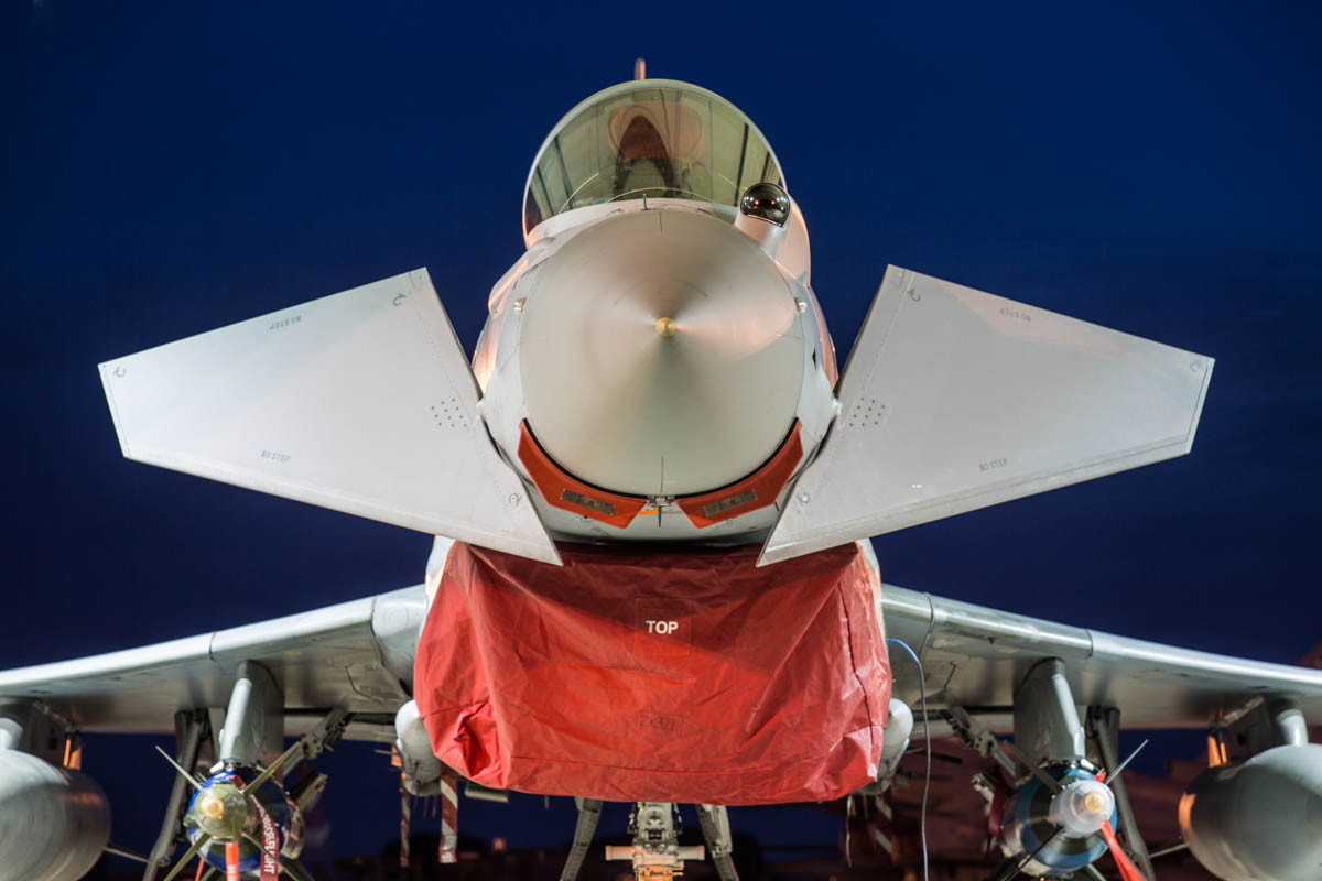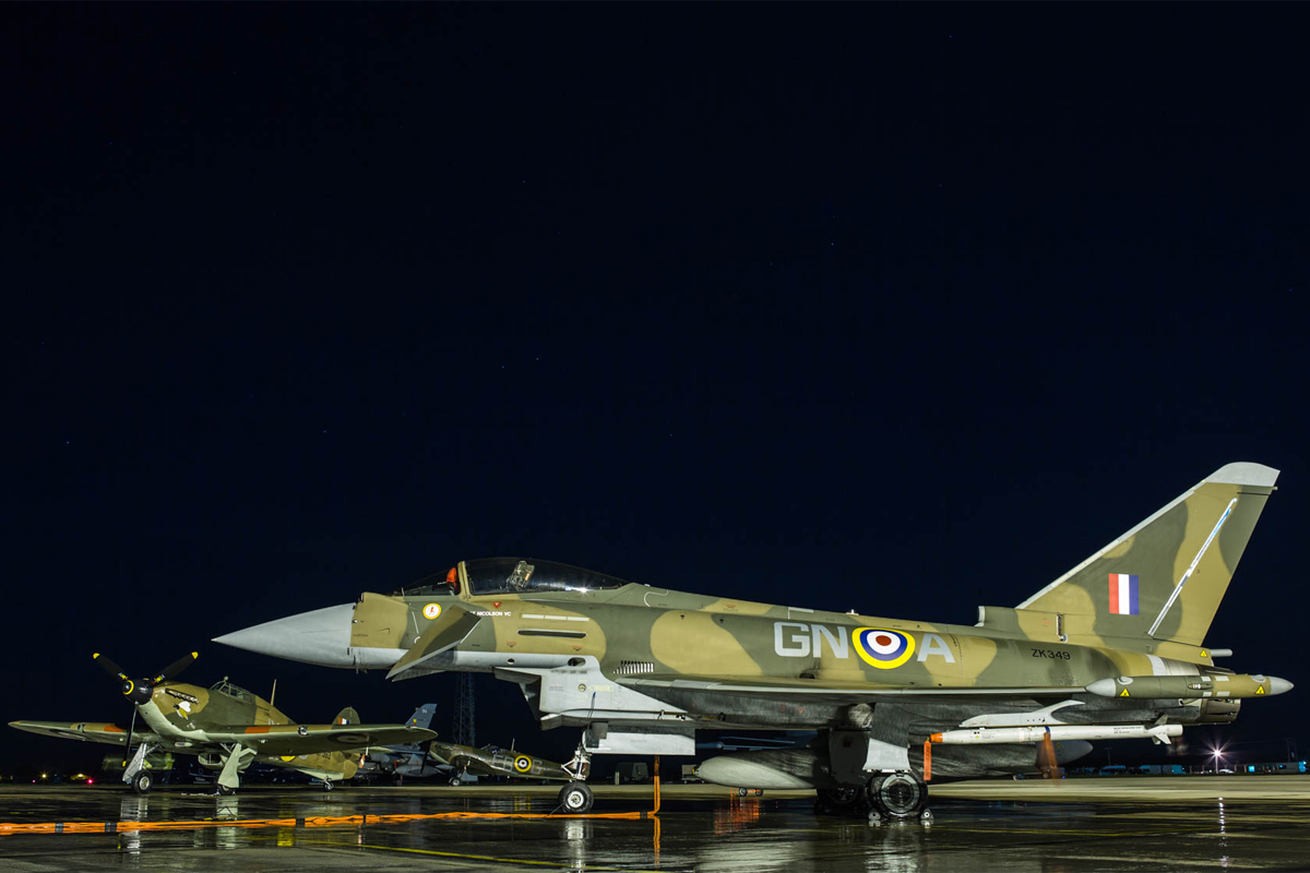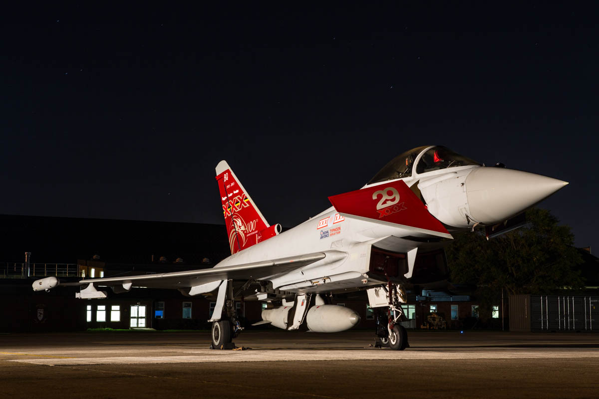 The aircraft that were available on the night were the Battle of Britain Memorial Flight (BBMF) Spitfire Mk.XVI and Mk.V together with the Dakota C.3 against the fence outside of their hangar. The E-3D Sentrys that are currently ‘boltholing’ from Waddington during runway work there were on their allocated pan while Spitfire Mk.IIa P3750 sat flanked by two 12 Squadron Tornado GR.4s – one of which was the newly decorated centenary special tail. Further down the line, the Syncro pair Typhoon FGR.4, wearing its camouflage scheme, was grouped with Hawker Hurricane Mk.IIc PZ835 and 29 Squadron’s centenary jet. A tooled up Typhoon FGR.4 sat in one of the EFASS (Expeditionary Forces Aircraft Shelter System) hangars with a line of operational jets, including the 41 Squadron special just outside.