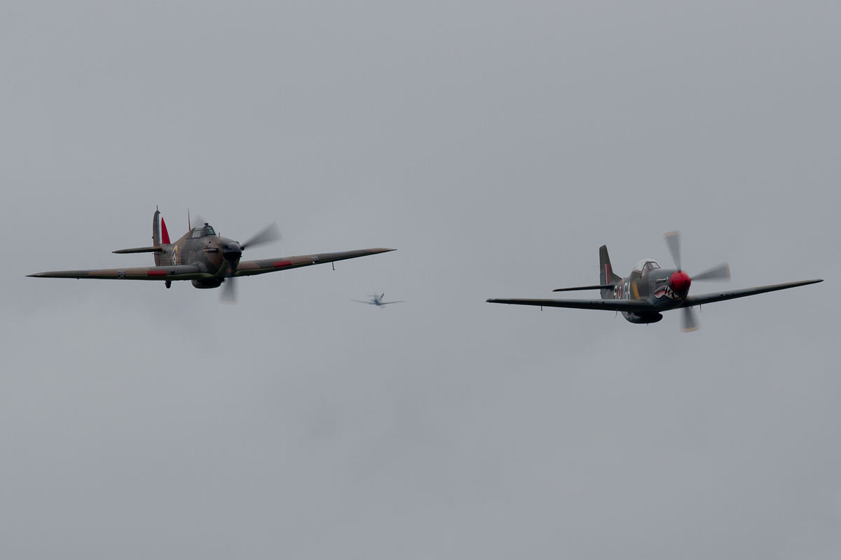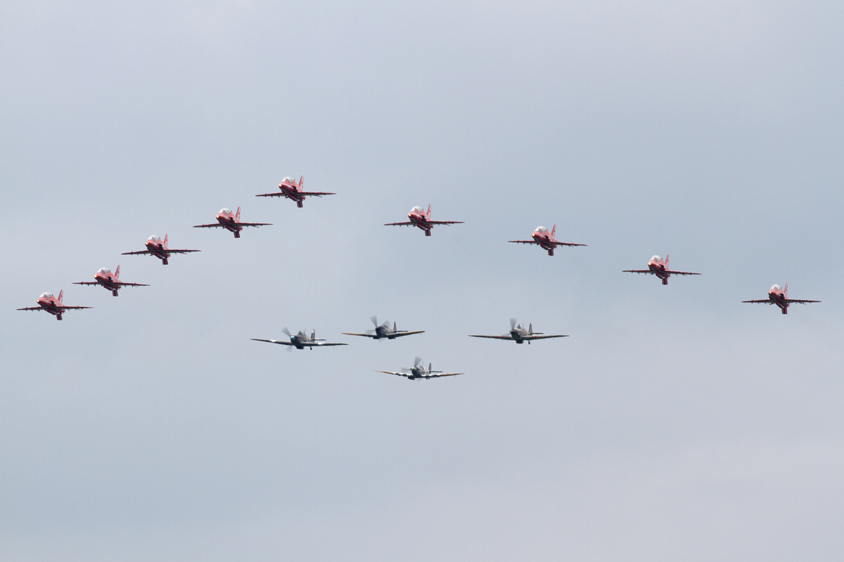The BBMF supported the show in force by bringing four fighters and the Dakota, the latter standing in for the grounded Lancaster. In addition to their solo displays and the Synchro routine, the two Spitfires and Hurricanes formed up with the Red Arrows in a pleasing formation to commemorate the 75th anniversary of the Battle of Britain.