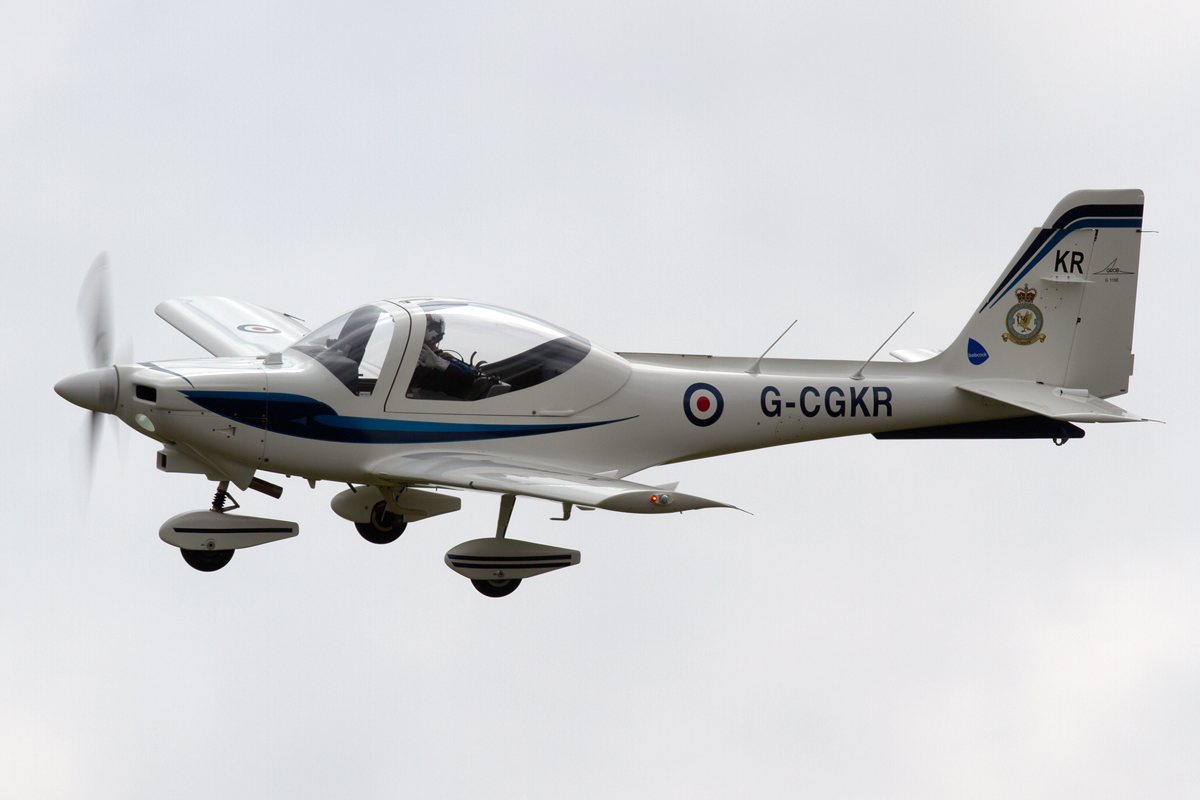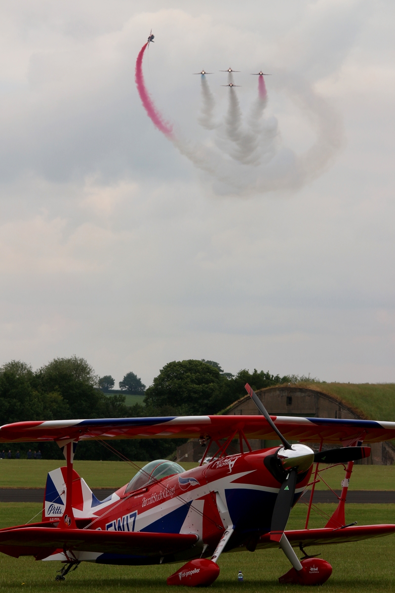 On the smaller end of the spectrum, the Cosford crowd were treated to a stomach churning display of aerobatics by Rich Goodwin in his highly modified Pitts S2S “Muscle Biplane”. The incredible performance of G-EWIZ allowed Rich to fly his best Harrier impression as the aircraft was flown to an almost complete hover, hanging by its propeller. An unlikely highlight of the show that has to be mentioned was Rich Goodwin’s stand in commentator Peter Dickson, otherwise known as ‘The TV Voiceover Man’. He came over as a passionate enthusiast and his humorous commentary fitted the display perfectly. Further solo aerobatics were provided by the RAF solo Grob Tutor display, using a University of Birmingham Air Squadron aircraft due to the adverse weather preventing the display aircraft flying in from Cranwell. Unfortunately the Tutor was not the only aircraft to fall foul of the weather on the Saturday arrivals day. Almost all of the static airframes representing the University Air Squadron theme had to cancel, along with the Scottish Aviation Bulldog programmed to join the Tutor in the flying display.