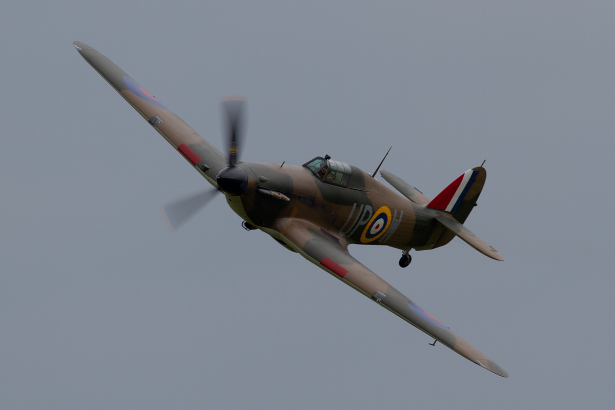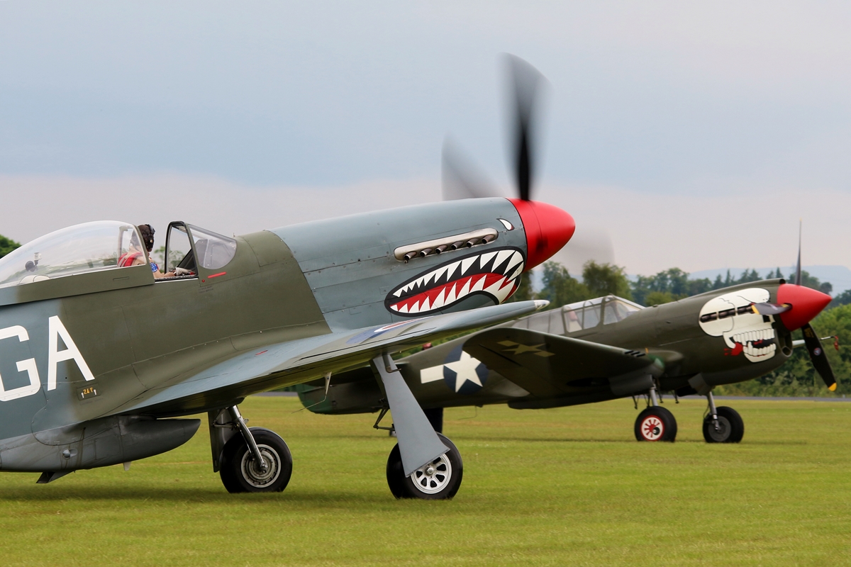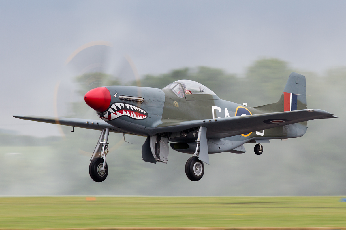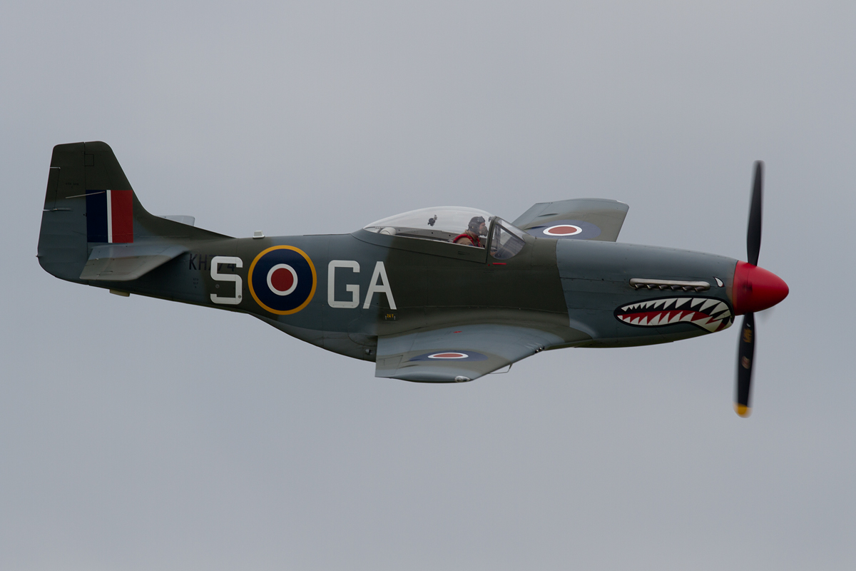 The finale of Cosford 2015 was a WW2 set piece intended to commemorate the 75th anniversary of VE Day. The display started with a well flown solo routine from the Classic Air Force’s Avro Anson T21 G-VROE (WD413) before it was intercepted by Cliff Spink in his regular mount: Duxford based Hispano Buchon G-BWUE owned by Spitfire Ltd. Despite not being a ‘real’ Bf109, the Buchon, still in the livery worn for the 1968 Battle of Britain film, was an impressive stand in and quickly dealt with the lumbering Anson. Almost immediately a Hurricane and Mustang were scrambled and a dogfight ensued. It is always a pleasure to see Peter Vacher’s Hurricane Mk.1 R4118, but even more so when flying alongside the newly painted ‘Shark mouth’ P-51 Mustang operated by the Norwegian Spitfire Foundation. Following the dogfight the individual aircraft entered into solo routines, of which the highlight was the arching topsides offered by Lars Ness showing off the Mustang’s immaculate RAF camouflage paint scheme.