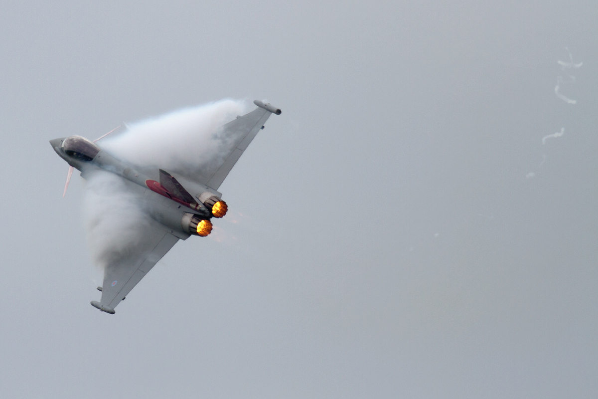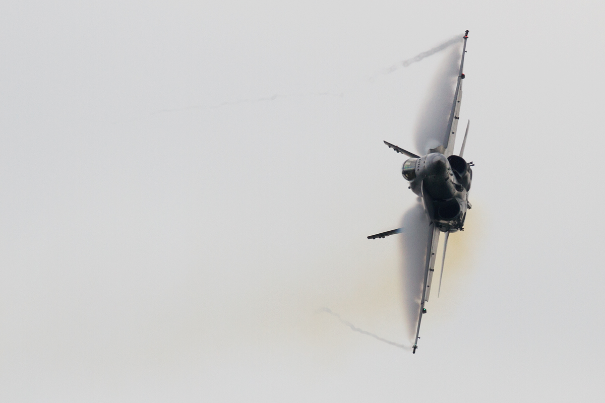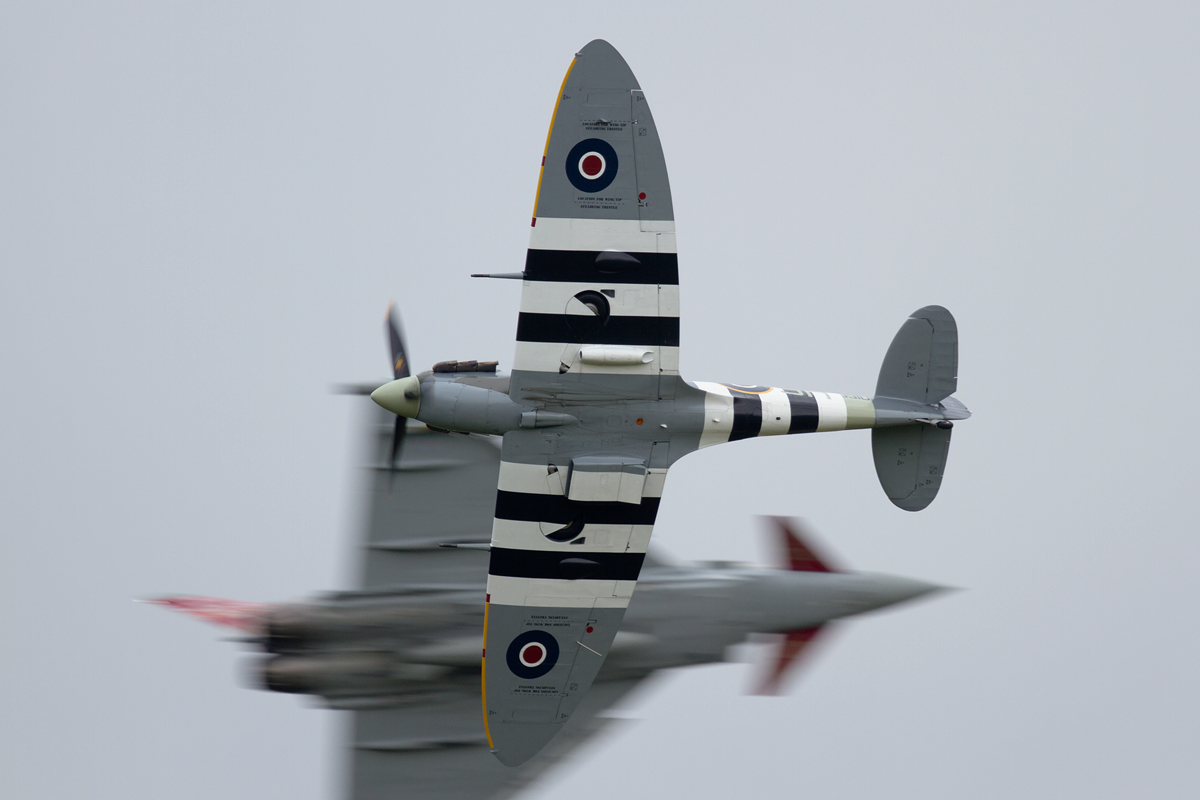 Not to be outdone, the RAF also brought some noise with both the familiar Eurofighter Typhoon FGR4 solo display and the Synchro Pair routine – a return of a display not seen since 2010. Solo display pilot, Flight Lieutenant Jonny Dowen, showed off the 29(R) squadron centenary jet superbly with plenty of tight high-G turns and liberal use of afterburner. The same Typhoon returned later in the hands of Flt Lt Ben Westoby-Brooks as he joined up with Flt Lt Antony Parkinson MBE of the Battle of Britain Memorial Flight in Supermarine Spitfire Mk.Vb AB910 for the Synchro75 pairs display. Sadly the specially marked Battle of Britain marked Typhoon was unserviceable at local RAF Shawbury,from where the fast jets were based for the show. Nevertheless, the perfectly symmetrical display of two world beating fighter aircraft separated by more than 55 years was a pleasure to watch, especially the final crossover and climb out that left the airfield shaking in the wake of two EJ200s in full reheat with a hint of the growl of a Rolls Royce Merlin!