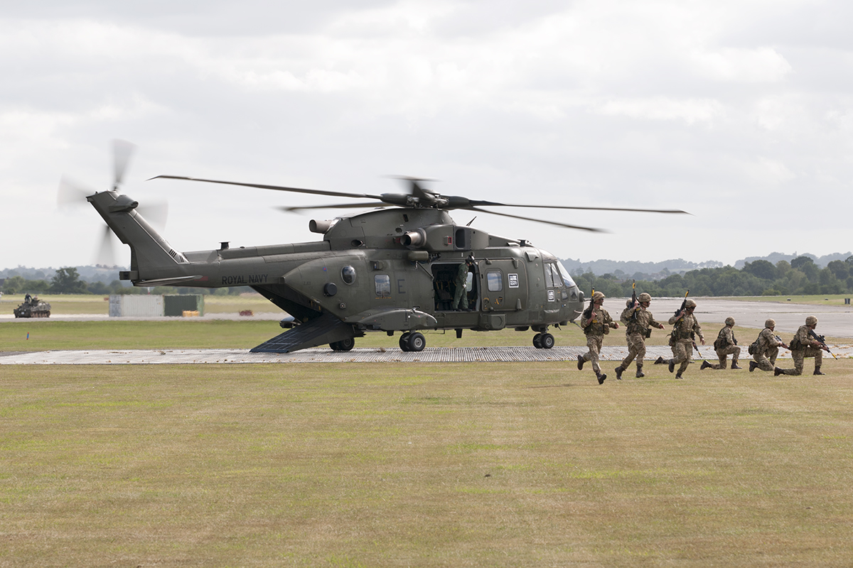 Not content with just these eight huge helicopters, the Role Demo also utilised the two Army Air Corps Apache AH.1’s seen earlier in the day, now flying under the callsign ‘Ugly’ to provide some fire support to the Royal Marines who were assaulting the airfield. In addition to this were a number of Lynx HMA.8s and Wildcat HMA.2s providing over watch with door gunners, together with a single Hawk T.1 providing top cover, running in for some strafing and bombing runs. With the sound of gunfire, lots of smoke, huge explosions and with helicopter noise filling the sky the crowd was kept up to date and looking in the correct direction by a very clear and concise commentary.