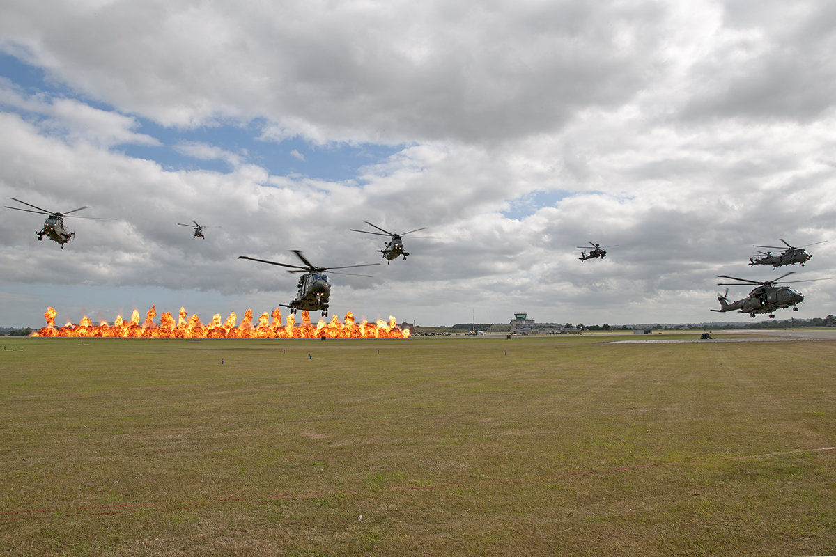 The Royal Marines soon overwhelmed their enemy and it was time for the helicopters to come in for their finale. With over a dozen helicopters forming up from left and right in front of the crowd they turned to face the massed public. The single Hawk thundered over the top of the formation and what followed was a huge wall of flame erupting from behind the helicopters – a truly fantastic end to the display and a fitting send off to the Sea King HC.4s at the end of their illustrious service to Queen and country. As the helicopters turned and filed away the crowd erupted with another huge round of applause to what they had just witnessed.