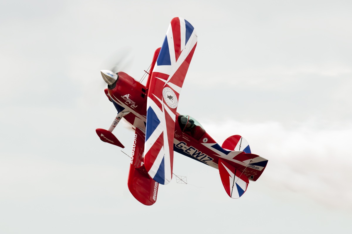Richard Goodwin took advantage of his colourful and highly modified Muscle Biplane by taking a short run off the opposite runway with a tailwind, as he performed his trademark eye opening take off low and sideways, much to the glee of the crowd. His performance is a credit to his ability, strength and fitness as his aircraft spins, tumbles and falls through the air in apparent complete control!