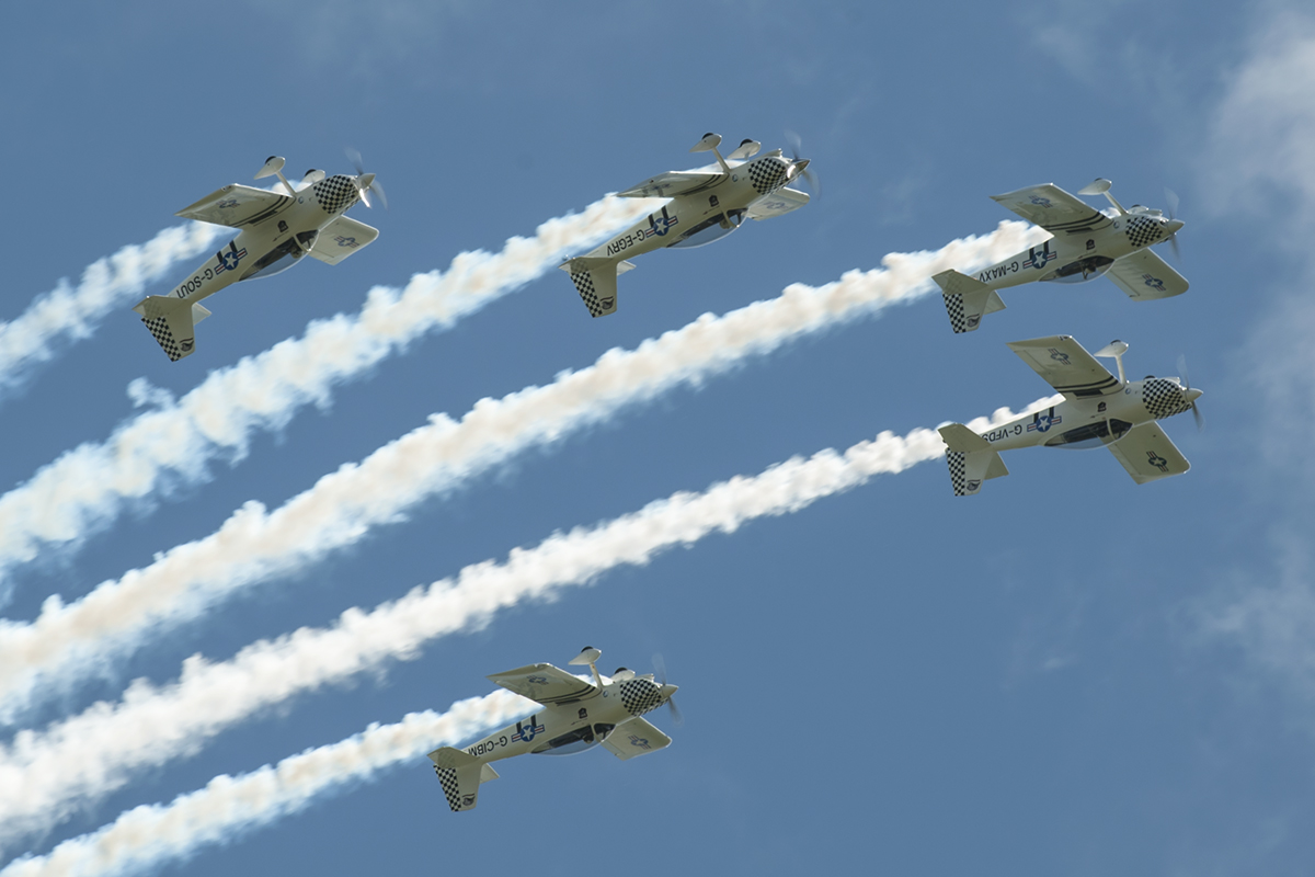 Team Raven is probably less well known than most civilian teams on the UK airshow circuit, but were a welcome addition to the line up and put on a very polished, well thought out and dynamic routine given the strength of the wind. Consisting of five Vans RV aircraft, they stand out well in a very photogenic white and black colour scheme. The lead aircraft G-MAXV is a RV4 twin stick flown by serving RAF Officer Simon Shirley, who has flown the Tornado F3, Hawk and Grob Tutor aircraft in his career. The other four aircraft are RV8’s flown by Steve Lloyd, Barry Gwynnett, Gerald Williams and airline pilot Mark Southern.