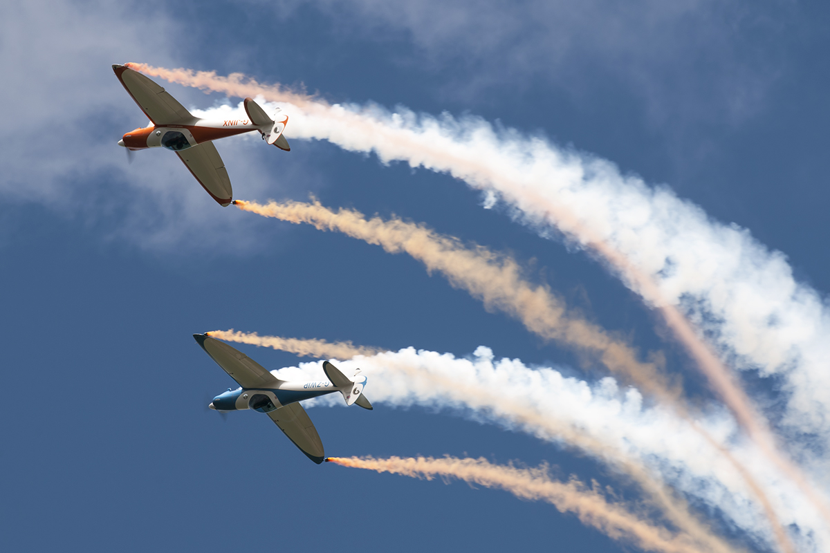 The two lightweight Silence DA1100 Twister aircraft fitted with integral smoke system and wing smokes belonging to the Twister Duo made light work of the crosswind and got airborne to perform a great aerial ballet, utilising their very effective smoke. The two aircraft seemed perilously close when in formation, but were beautifully controlled by the experienced pairing of Peter Wells and Chris Burkett.