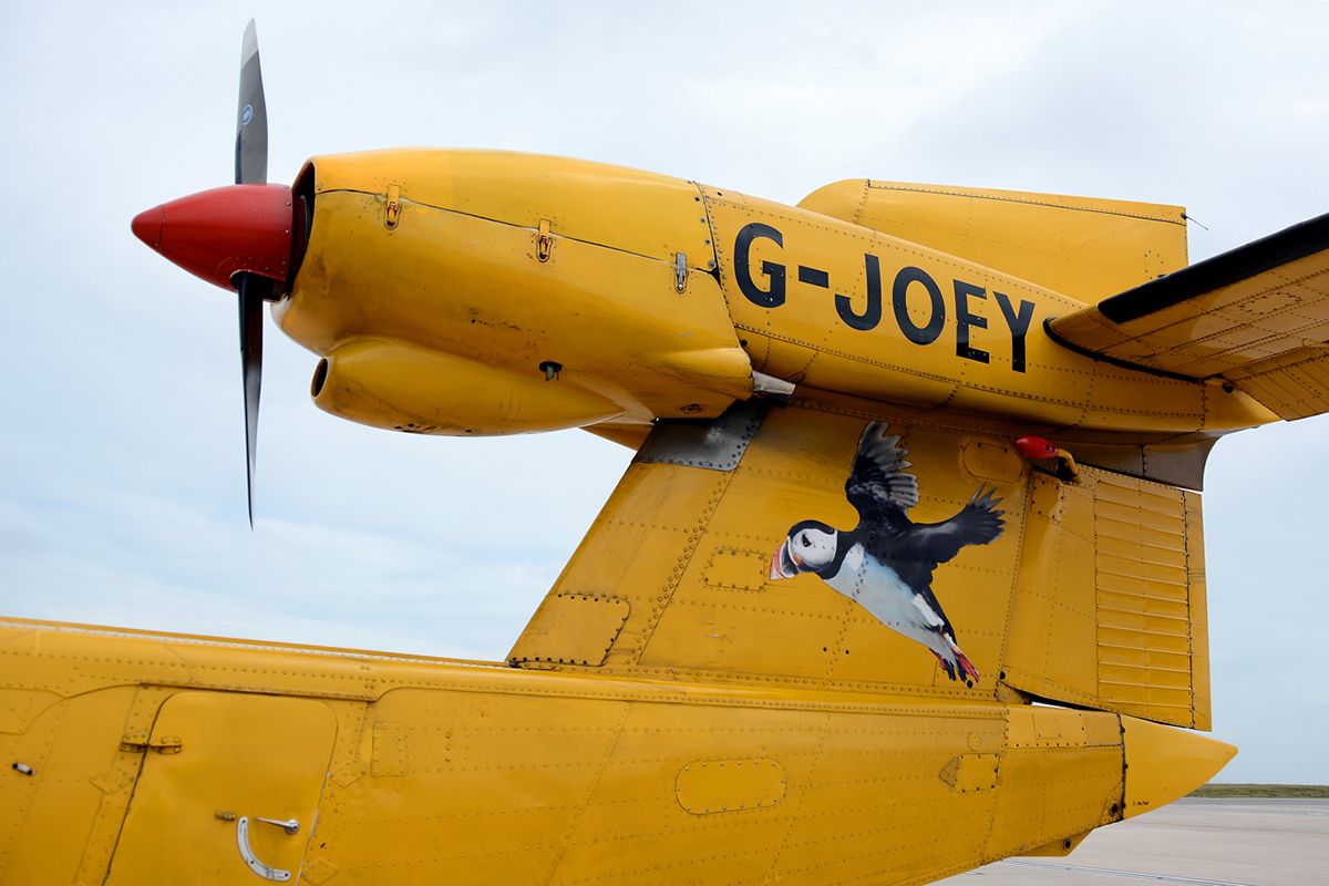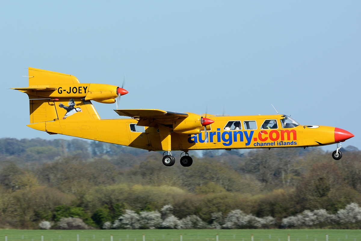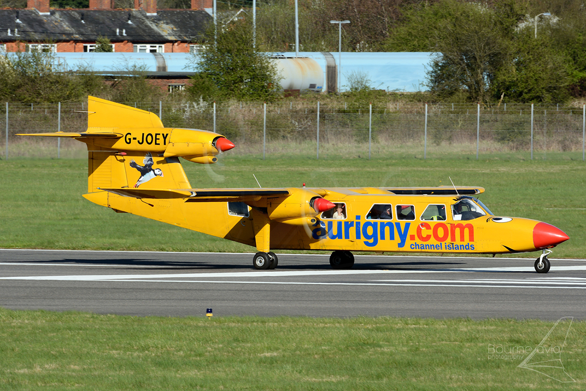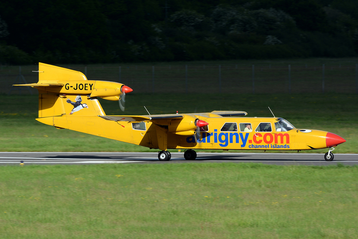 Construction number 1016 was originally delivered under the registration G-BDGG, owned by Britten Norman. The aircraft then went on to Canadian Airline, Simpson Air Canada under the identity of C-GSAA in December 1975. 15th July 1979 saw it return to the United Kingdom and back onto the British register under its former registration G-BDGG one again owned by Britten Norman. On the 15th June 1979, 1016 was chartered to Aurigny where it flew for two full years. During this time the aircraft wore the remnants of Simpson Air Canada’s paint scheme with basic Aurigny titles. Then, on 27th November 1981, Aurigny purchased the aircraft outright from Britten Norman, registering the aircraft under the famous G-JOEY. Since then JOEY has been used extensively for publicity purposes with the Airline. Over the years Aurigny have developed a wide range of JOEY merchandise ranging from coloring books to a “JOEY Fun Zone” for children and even a JOEY club. However perhaps amongst the most popular marketing idea was “JOEY’s Scenic Tours”. These proved very popular taking people for a 20-minute scenic tour of individual Channel Islands including Guernsey and Alderney. JOEY himself will fly the last of these tours on June 27th 2015 from Alderney.