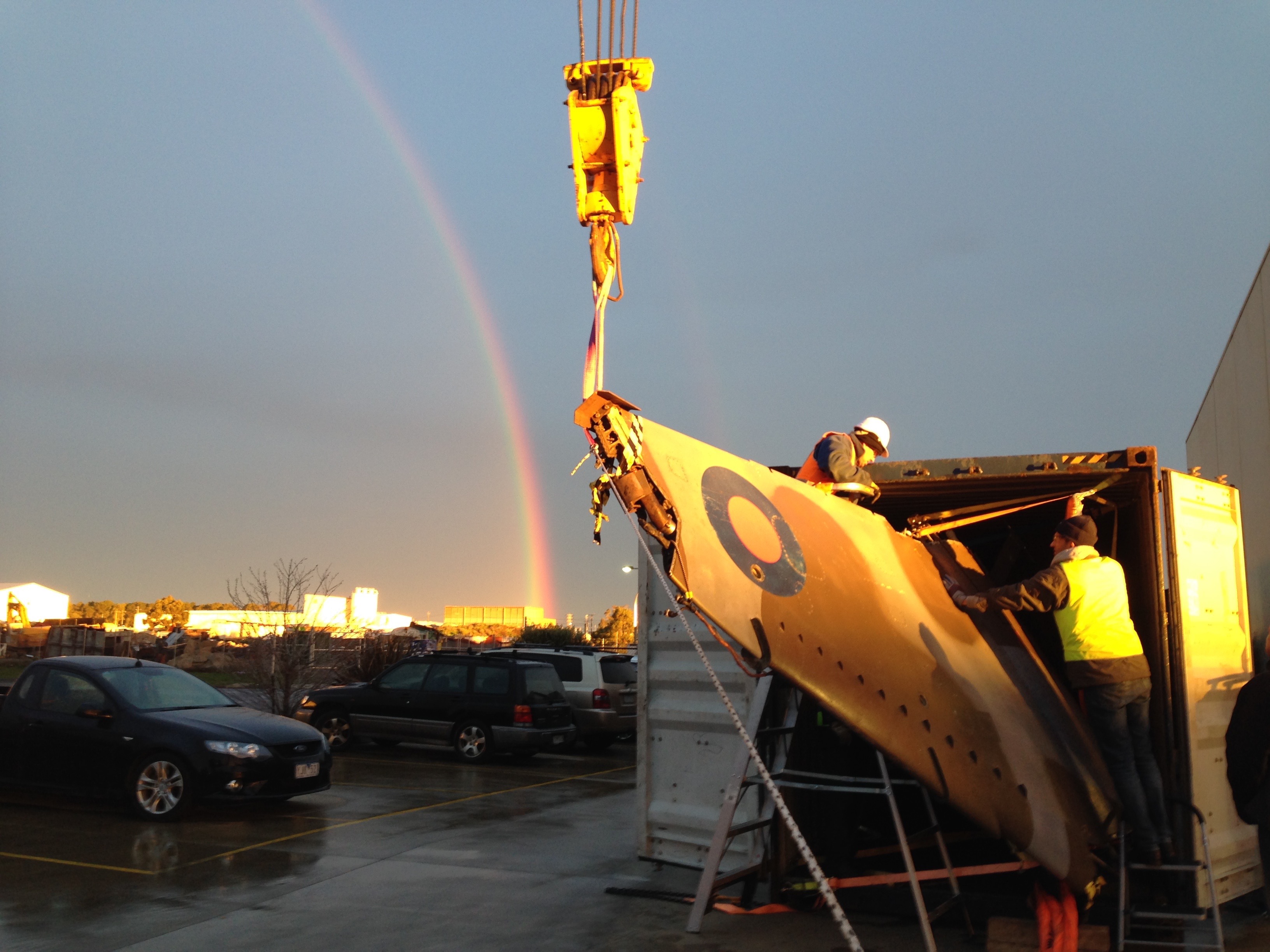 After her purchase in January 2015, with fantastic support from Everett Aero, the aircraft was shipped to Australia in April 2015, arriving in early June. The fuselage went on a Ro-Ro trailer and travelled west via the Panama Canal. The wing section came in a 40′ shipping container, with inches to spare, and travelled east via Malaysia arriving only a few days after the fuselage.