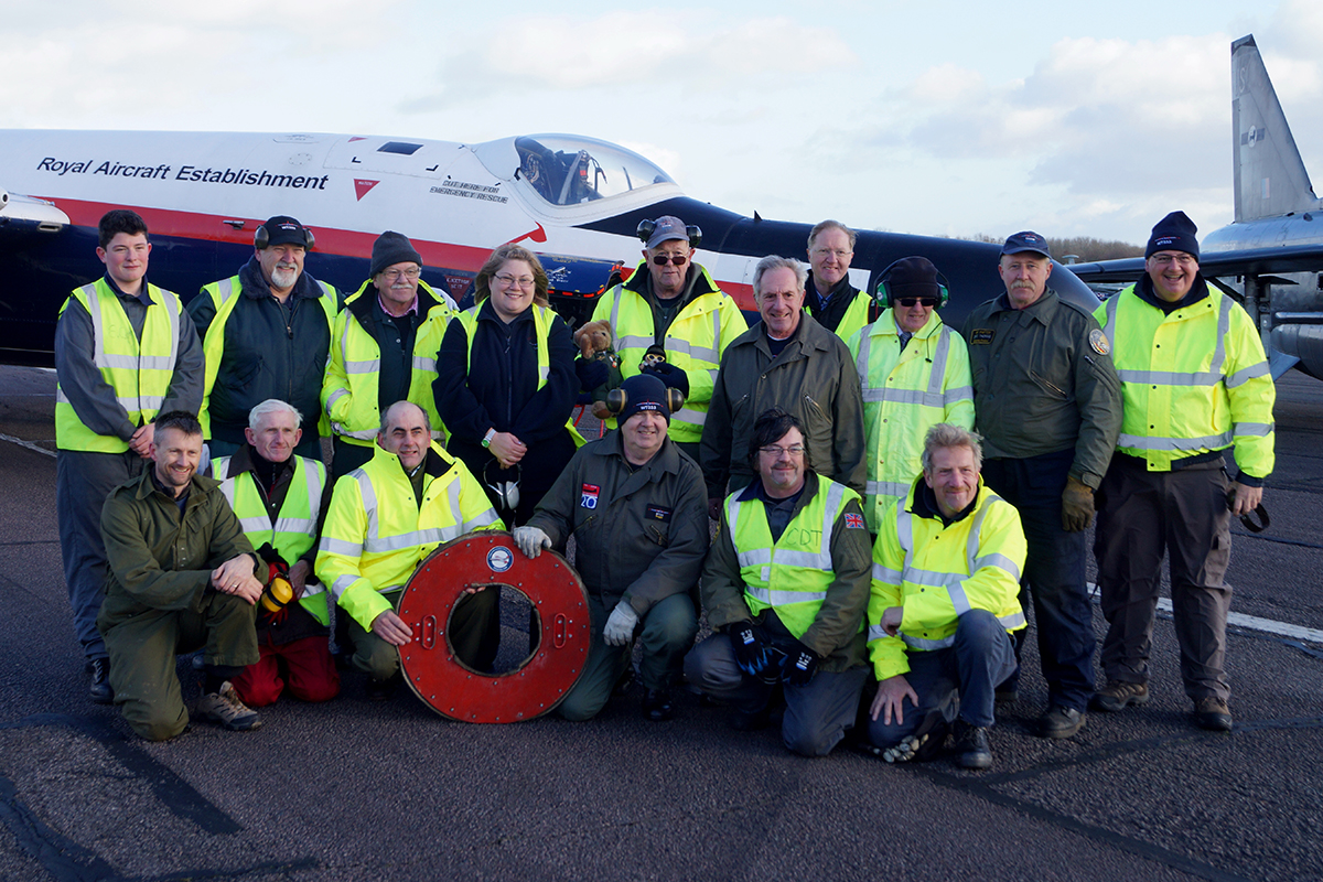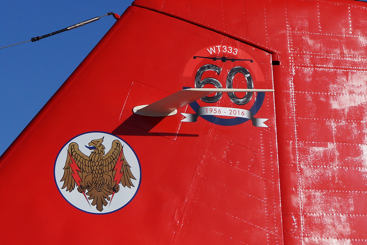 In the weeks leading up to the event, the group’s working parties spent many an hour – sometimes at the mercy of Mother Nature – keeping ‘Treble Three’ in working order. As Stephen Reglar, the Team’s Adjutant pointed out “Treble Three now qualifies for her bus pass and she is entitled to have the odd need for special attention!”. Tasks included a number of anti-det runs, the application of a specially commissioned anniversary logo designed by Spencer Trickett of Skytoons Aviation art on the tail and replacing the Radar Research Flying Unit badges also on the tail. A small snag with one of the jet’s Rolls Royce Avons was also rectified.