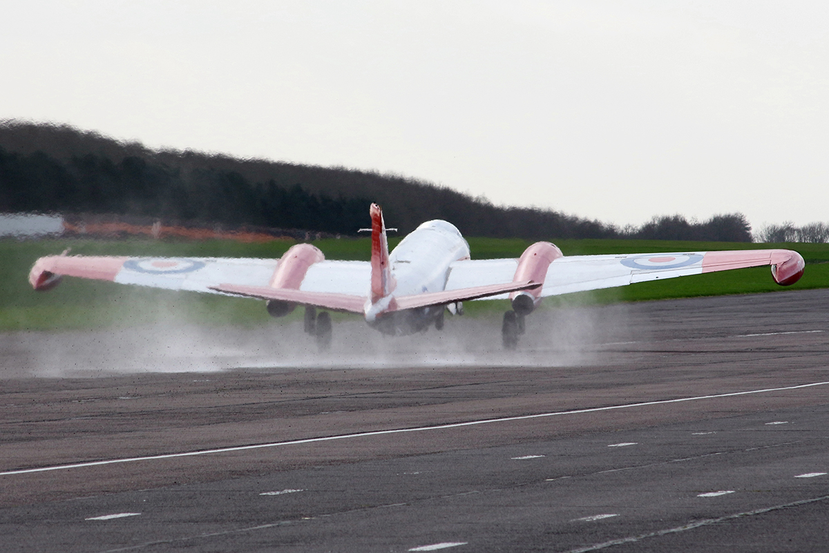 Sat there on the runway as Dennis went through the last of his checks, it was strange to think that this very machine had done the exact same thing 60 years ago to that very day. And yes, for just under 40 of those the aircraft was under the care of the various research and trials establishments, but for over two decades it has been sheer determination, effort, hard work and dedication that has kept WT333 alive – a testament to those few who have done it. With checks done and a last thumbs up, ‘Treble Three’ began to roar as Dennis powered up and got both Avons talking – each capable of producing 7,400lbs/thrust – and let the brakes off. To say the machine leapt off the line is a huge understatement and fighting a rather gusty crosswind, it was incredible to see the jet suddenly rear up on the main wheels for just few seconds and show off a huge amount of ‘topside’ as the nose pointed into the sky – an emotional moment for the ‘Bee’s’ family knowing he was the man to do it first 66 years ago. Dropping the front wheel back down onto terra firma, the jet was suddenly quiet as Dennis ‘chopped’ the power and rolled out. He later went on to say that the machine had run “faultlessly” and that the “the nose wheel lift-off was unintentional!”. It may have been short run but WT333 certainly done it in style – not bad for an old one.