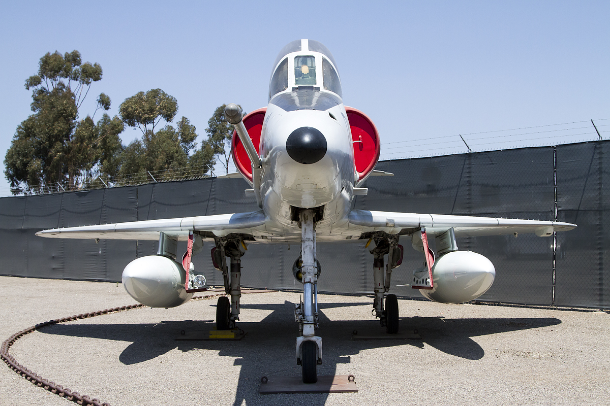 McDonnell Douglas A-4M Skyhawk (160264) – This aircraft was the last of 2960 A-4s that were built and was delivered in 1979. Entering service with VMA-223, the aircraft carried a unique paint scheme representing every airforce that operated the type – US, Israel, Australia, New Zealand, Argentina, Kuwait, Indonesia and Brazil along with markings for the Blue Angels display team. The aircraft has recently been returned to this scheme for display at the museum