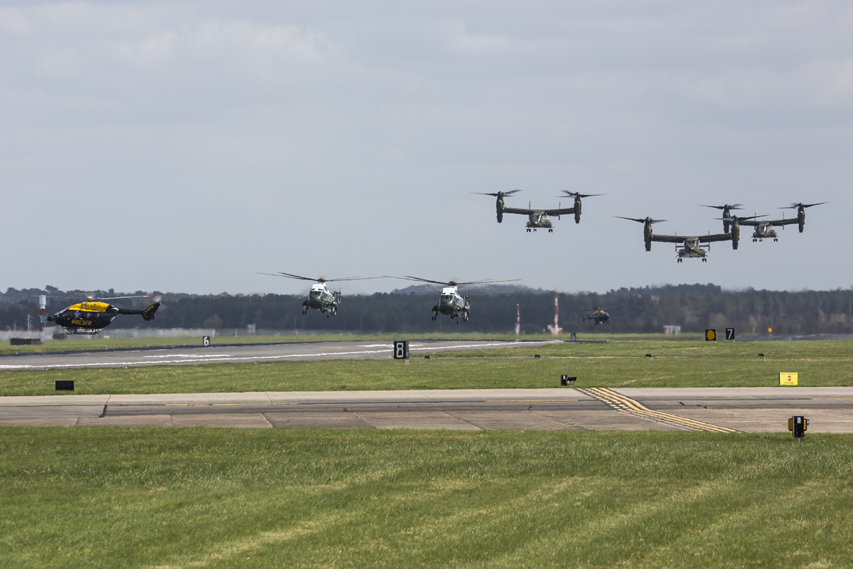 The photographs accompanying this article were taken on April 19th, when all six HMX-1 helicopters performed a rehearsal of their task – the five at RAF Mildenhall joining the VH-60N from RAF Northolt en route. As has happened in previous years, a pair of Metropolitan Police Air Service helicopters (Eurocopter EC145s G-MPSA and G-MPSB, flying as “Police 251”) flew escort and guidance for the formation, having arrived earlier in the morning.