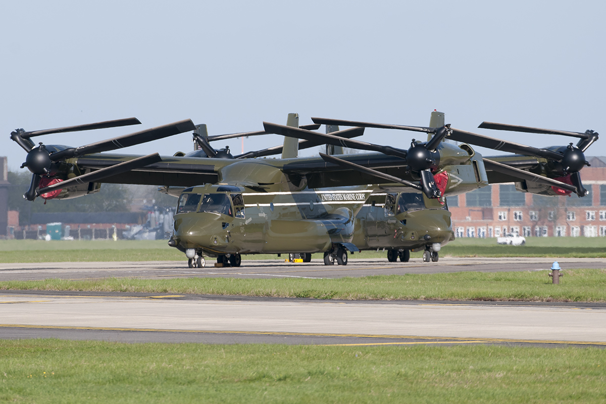 Since that time, the CH-46 has been phased out from United States Marine Corps service – and that extends to the retirement of the HMX-1 examples. As with their front line fleet siblings, the HMX-1 CH-46s have been replaced by the MV-22B Osprey. 2016 marks the first deployment of HMX-1 MV-22Bs to RAF Mildenhall, having arrived from Lajes Field on 15th April, supported by three USMC KC-130Js. The type previously deployed to the UK in August 2014 and supported the arrival of President Obama at RAF Fairford. The MV-22Bs fill exactly the same role as their CH-46E predecessor, but offer significant range and speed advantages over the older Sea Knight – especially key for the complex logistical plans that come as standard with the presidential airlift task. The three aircraft deploying to Mildenhall in April 2016 are 168284/02, 168332/10 and 168339/12, and all three are in the standard olive green colours worn by the type. Since arrival the three MV-22Bs have been marked with a single digit code corresponding to their callsign (i.e – 168284 flew as “Nighthawk 3” and therefore carries the code “3” on the starboard sponson).