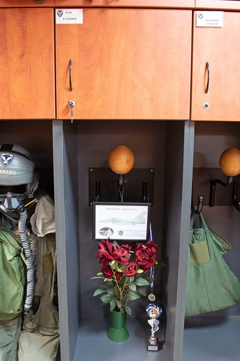 During our visit to the ‘Star’ squadron, a memorial to Captain Iliakis was pointed out by the Commanding Officer of 343 on the wall as you enter the squadron’s building. I was then shown to the 343 Mira Safety equipment room, and where Captian Iliakis locker and its contents which remain as they were on the day he made the ultimate sacrifice. It was a truly moving and humbling experience to be allowed to see this memorial to a man who is fondly remembered and honoured by his Squadron. There is also a memorial on the island of Karpathos to Captain Iliakis at the port of Pigadia.