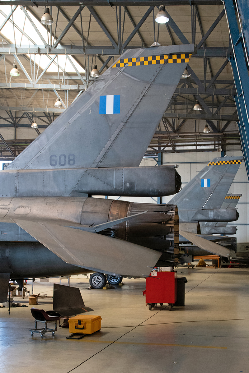 The HAF Vipers are well known for their unique paint scheme, known as ‘Aegean Ghost’ or ‘Ghost’ the official title is ‘Have Glass’ – a radar reflective paint which reduces the radar cross section of the aircraft. The coating is surprisingly rough to the touch and therefore attracts dirt and grime which gives the aircraft a very photogenic, well-used and weathered look.