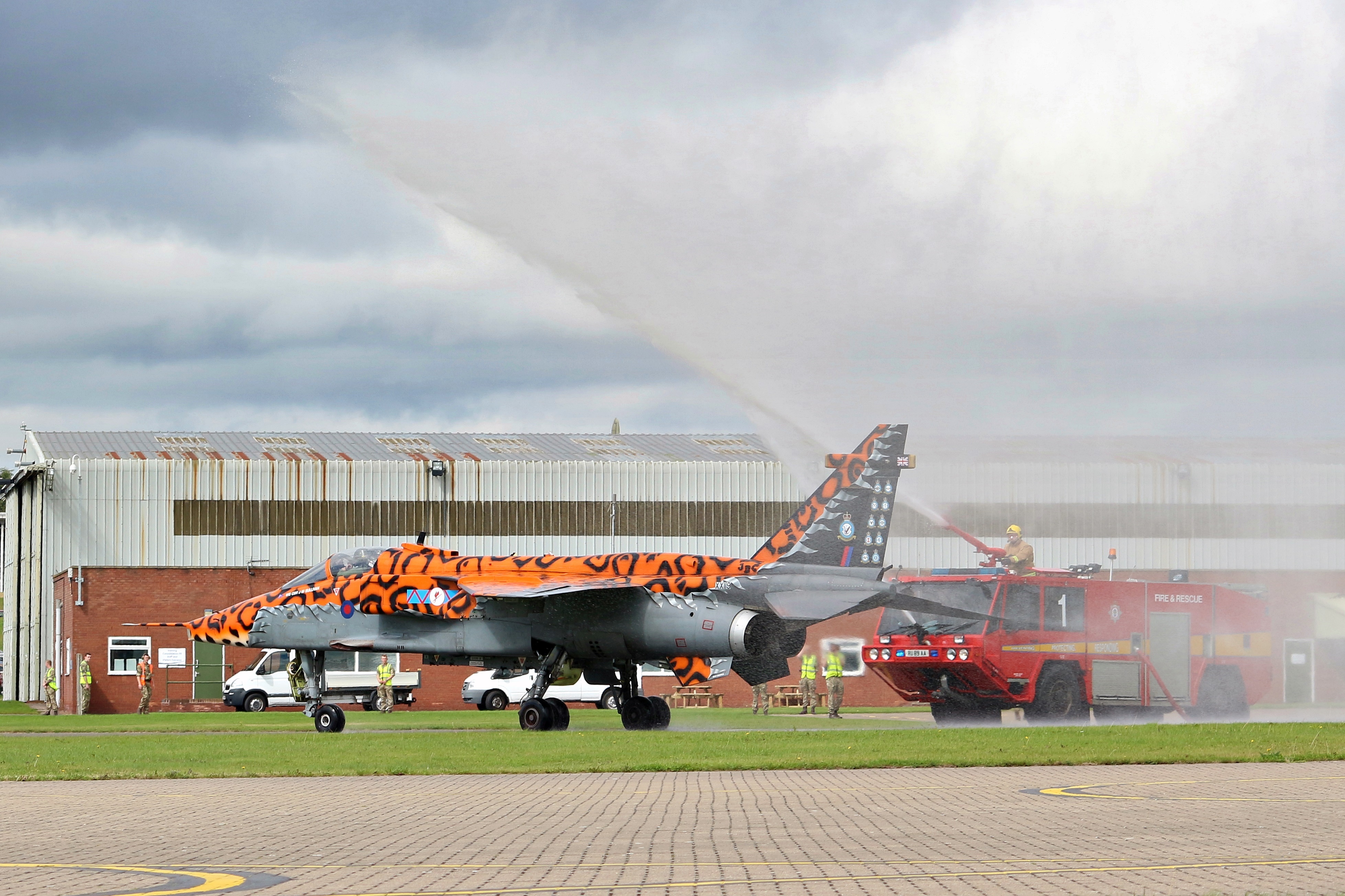 After almost an hour – which allowed almost every possible angle to be covered – it was time to once more clear the parking area and await the second and final taxi runs. As the four aircraft started, accompanied by their famous deep boom as the engines spooled up, they slowly set off one by one and gathered in a line on the far dispersal. From there, the Jags were given a final chance to apply a just that little bit of power – as much as can be when pointed directly at a line of enthusiasts! – and stretch their legs for the last time. While this was going on the airfield fire crew prepared for a final salute. Led off by the Granby schemed machine, followed by the pair of T4s and then ‘Spotty’, the jets made their way under a water cannon salute and back towards their hangar. Whilst the first three aircraft shutdown, it was time for just one more sortie – the honour falling to XX119. Returning from the where it had started the day, it was fitting that this striking machine performed the final ever taxi run some nine years after making the last flight of a RAF Jaguar flight on July 2, 2007.